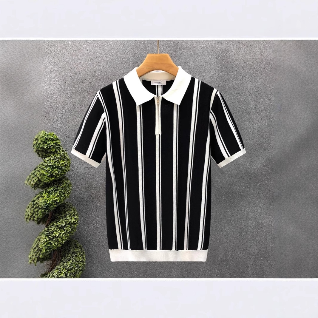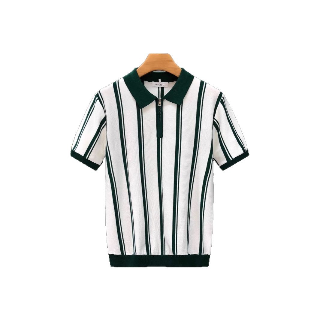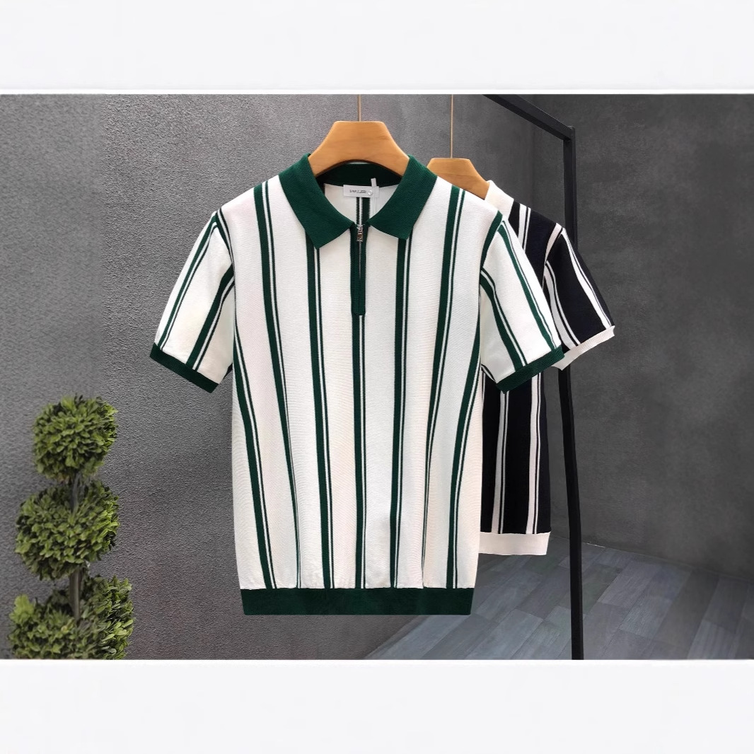 新款双肩拼色翻领POLO衫潮男复古修身短袖T恤休闲男士上衣潮