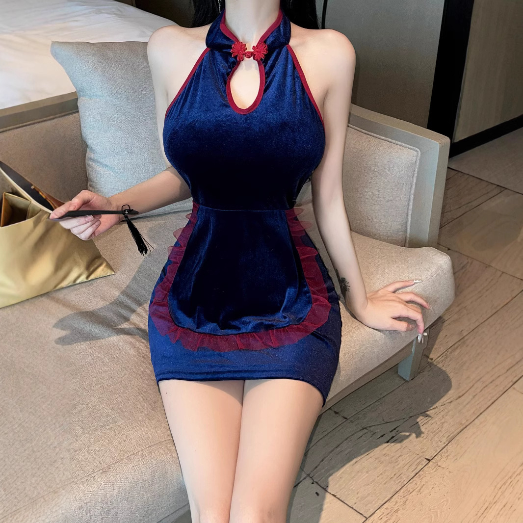 设计感镂空挂脖气质无袖丝绒蕾丝荷叶边性感辣妹包臀收腰连衣裙女