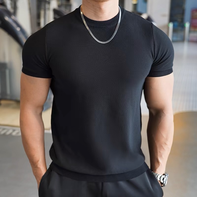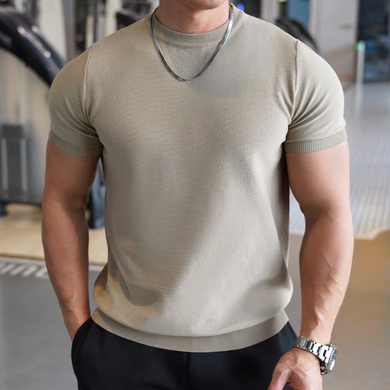 新款男士夏季健身短袖男士圆领纯色宽松弹力春夏套头上衣打底衫男