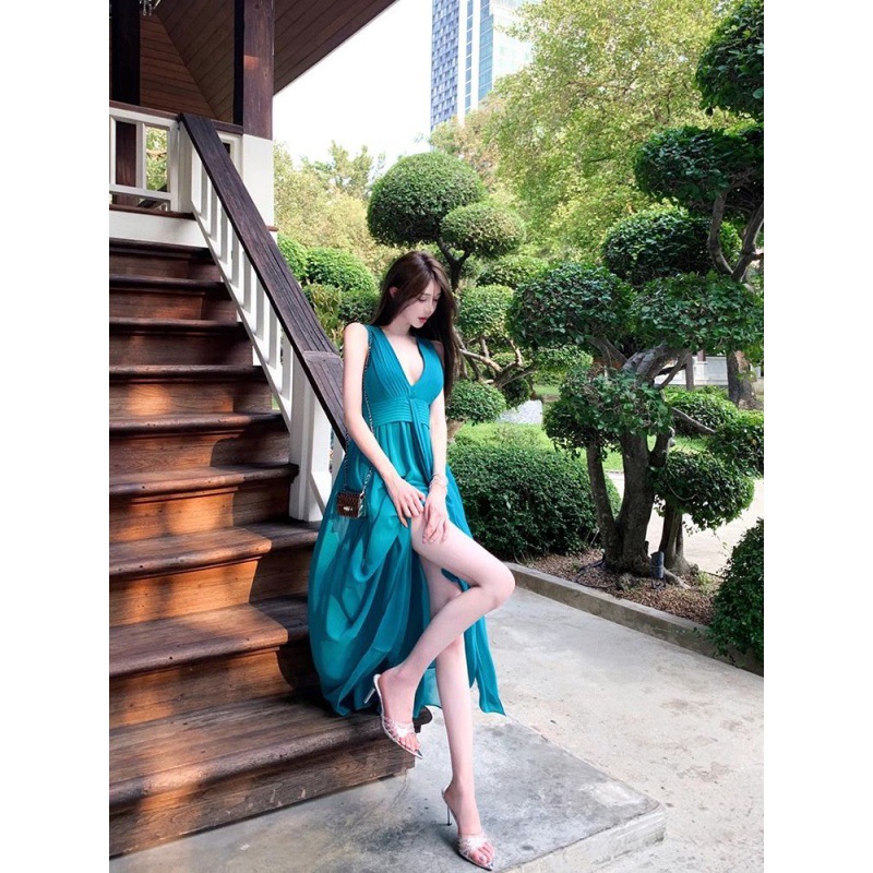 春岛仲夏 绝美显白孔雀蓝度假连衣裙V领雪纺长款背心裙显白气质裙