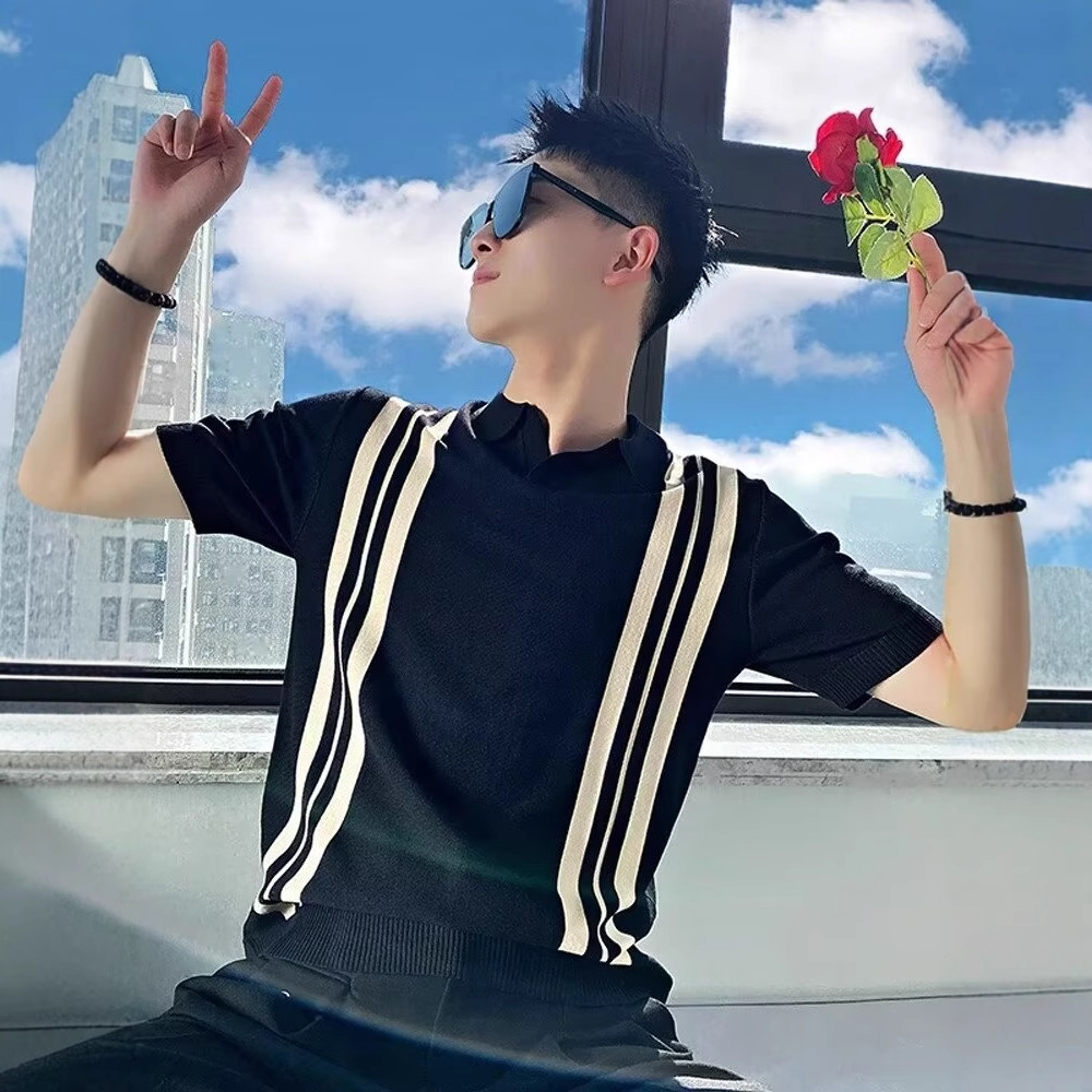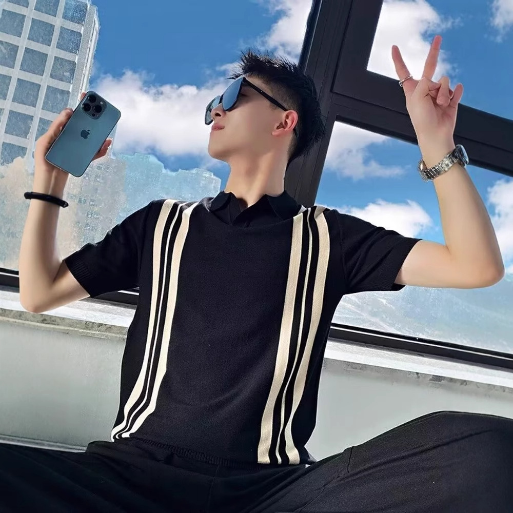 2025跨境夏季Polo衫男士装休闲翻领修身半袖条纹撞色薄款百搭短袖