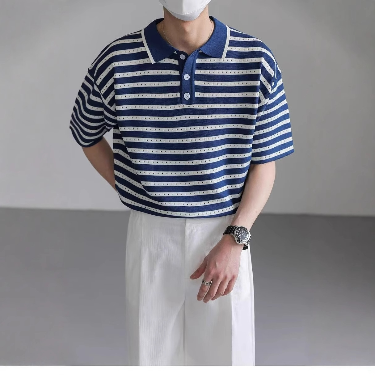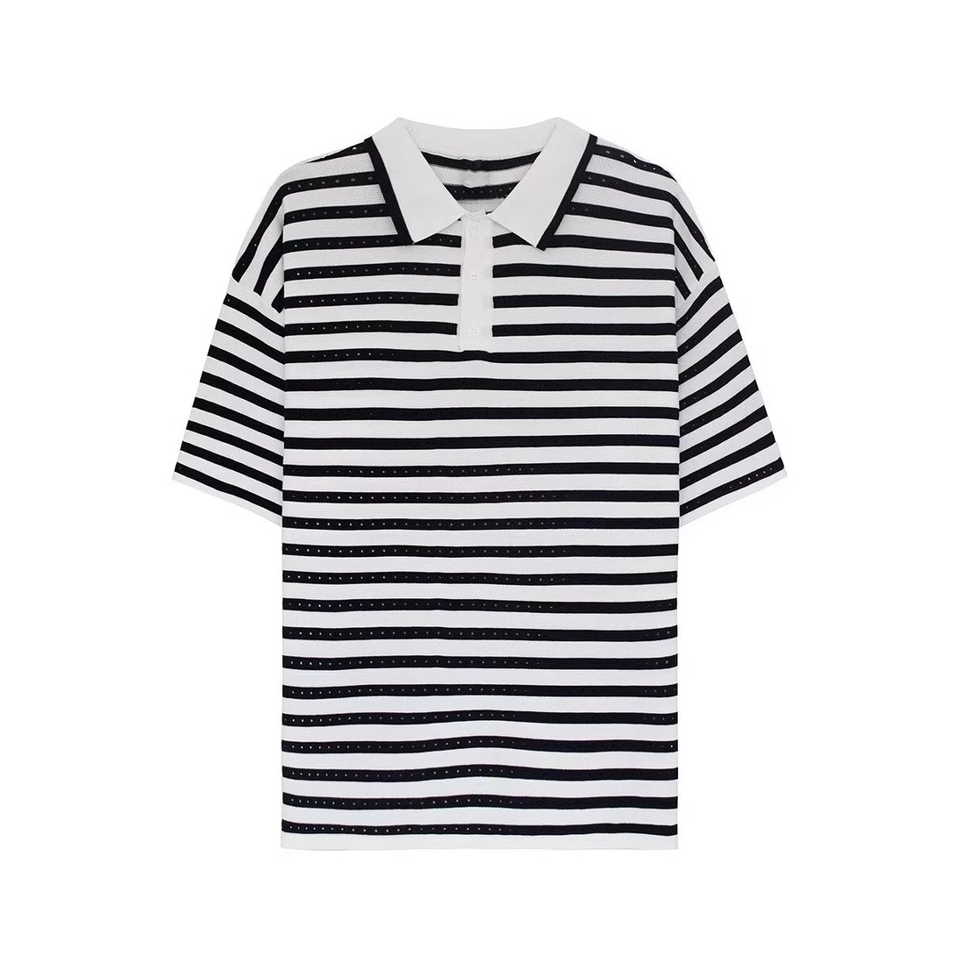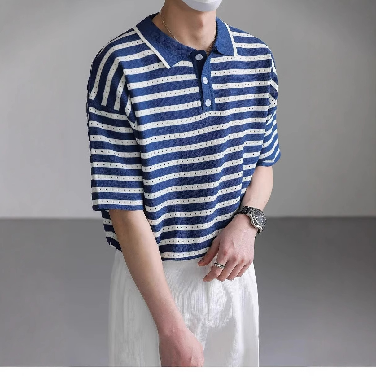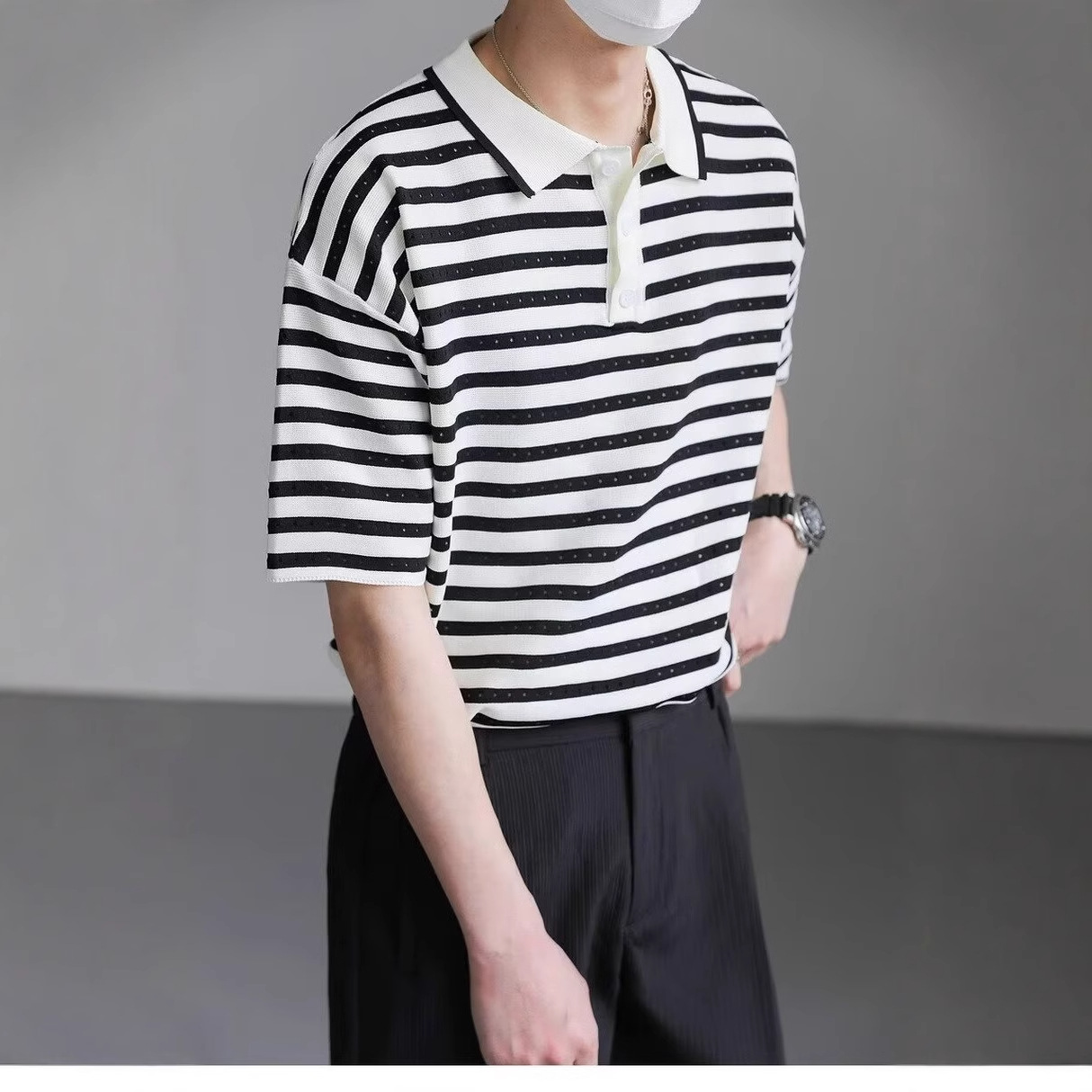 设计感镂空条纹翻领POLO衫男短袖T恤夏季上衣潮流宽松半袖体恤男
