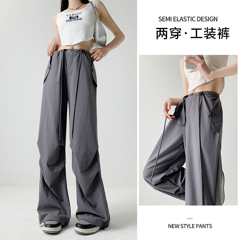 美式风工装裤女装裤子春夏女高腰宽松降落伞裤辣妹直筒阔腿运动裤
