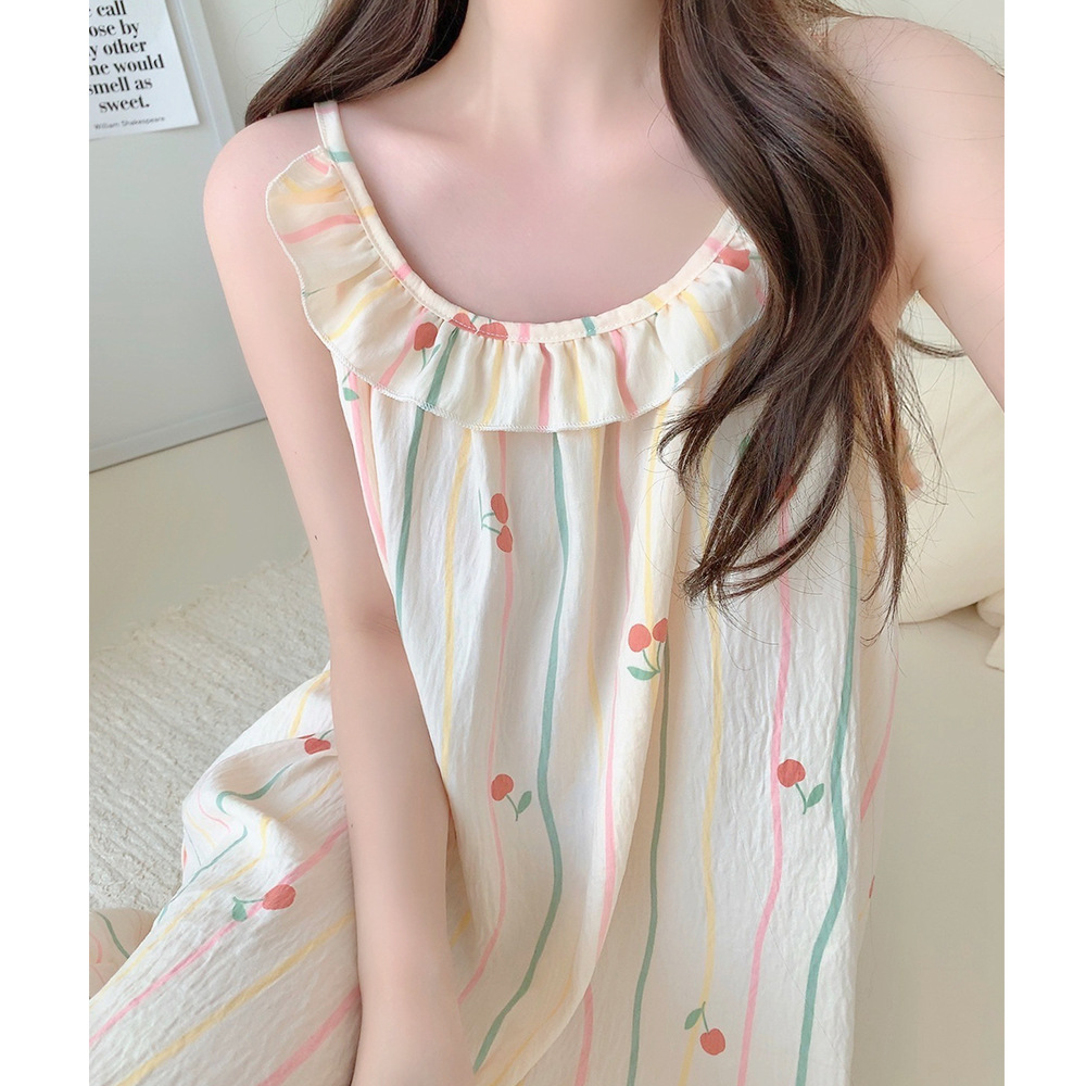 日系甜美吊带睡裙女夏季纯棉中长款条纹可外穿夏天学生睡衣家居服