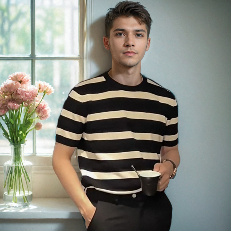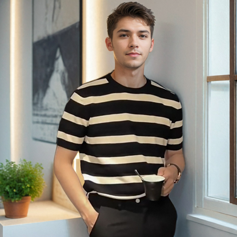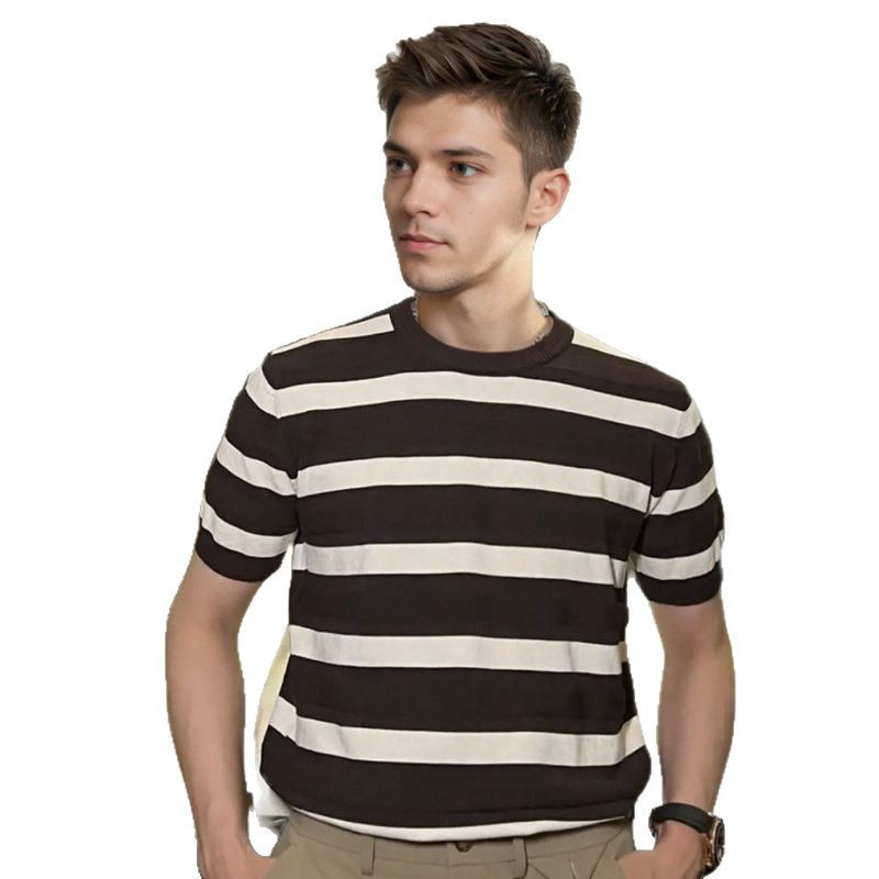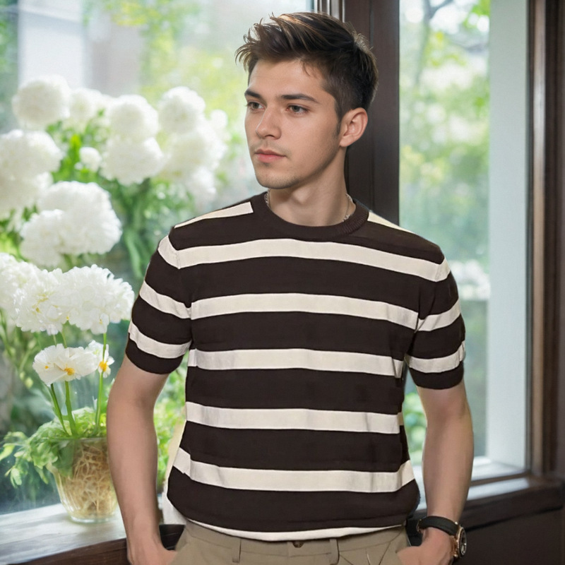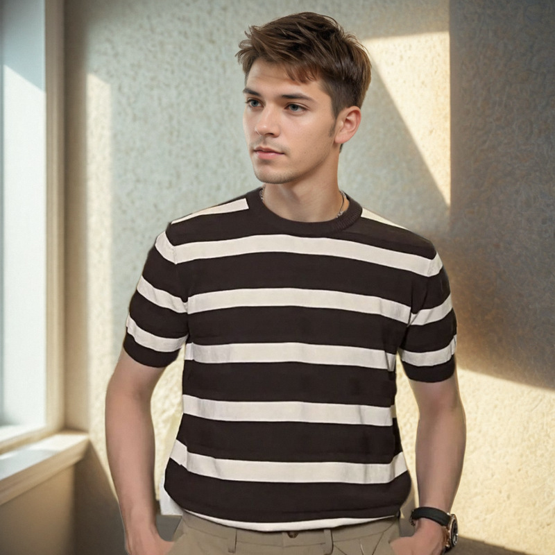 针织冰丝透气短袖T恤男士修身上衣夏条纹撞色休闲时尚ins潮流圆领