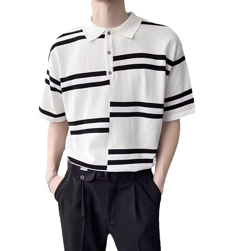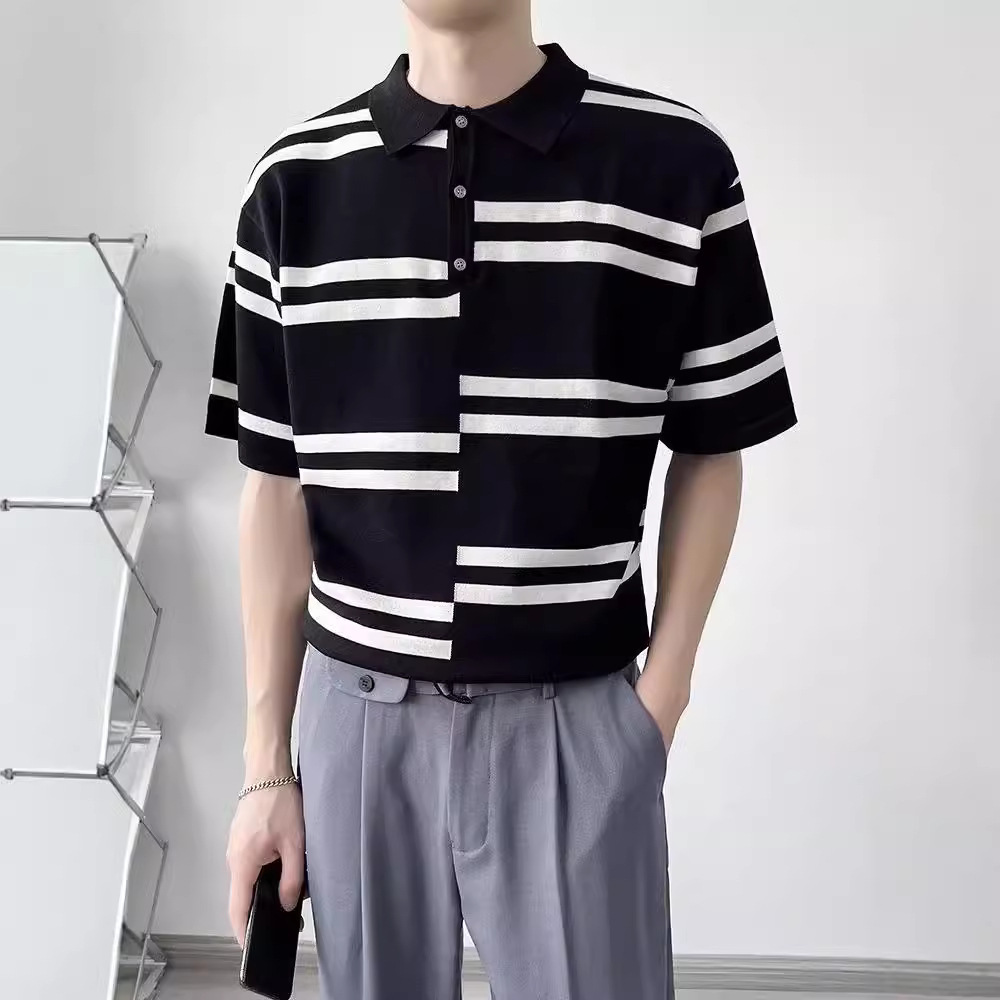 夏季短袖POLO衫男经典条纹透气修身薄款针织体恤商务休闲翻领T恤