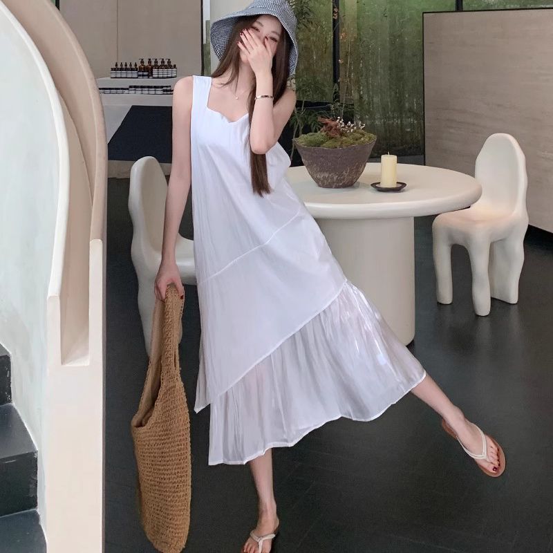 新款夏季气质A字裙中长款裙子设计感假两件拼接背心连衣裙女