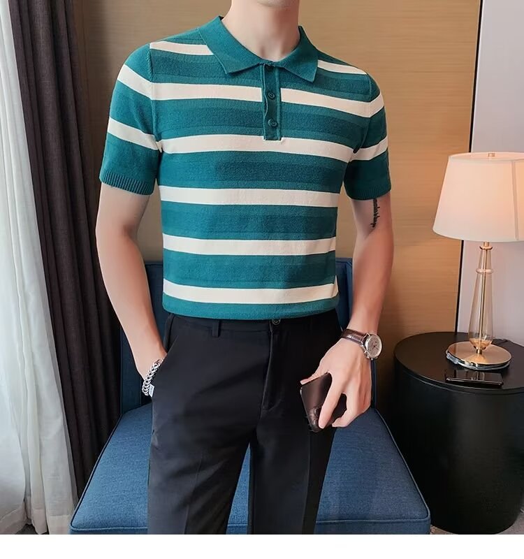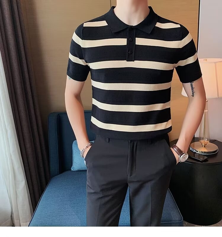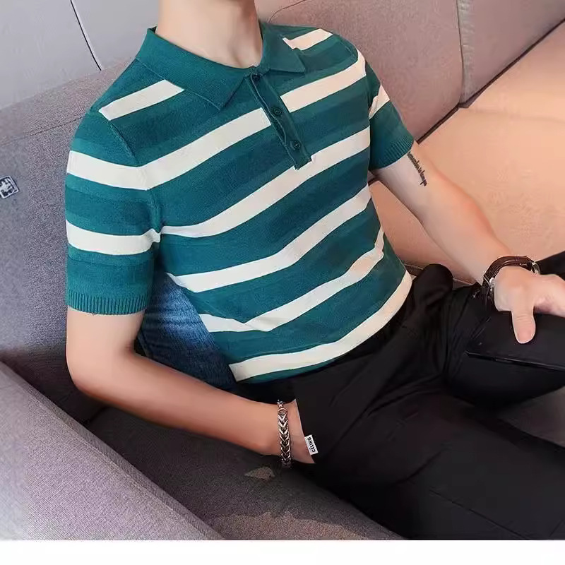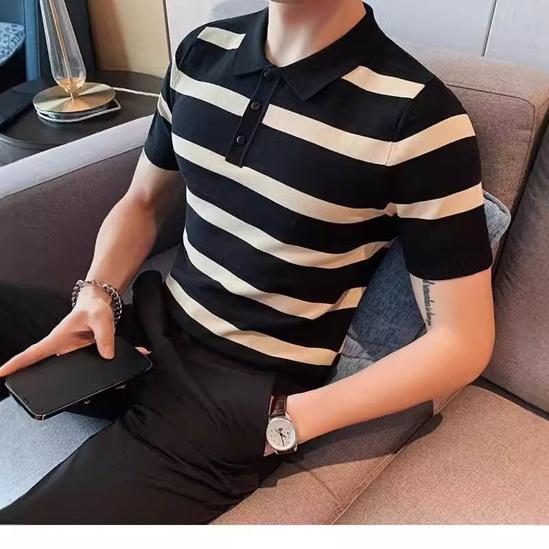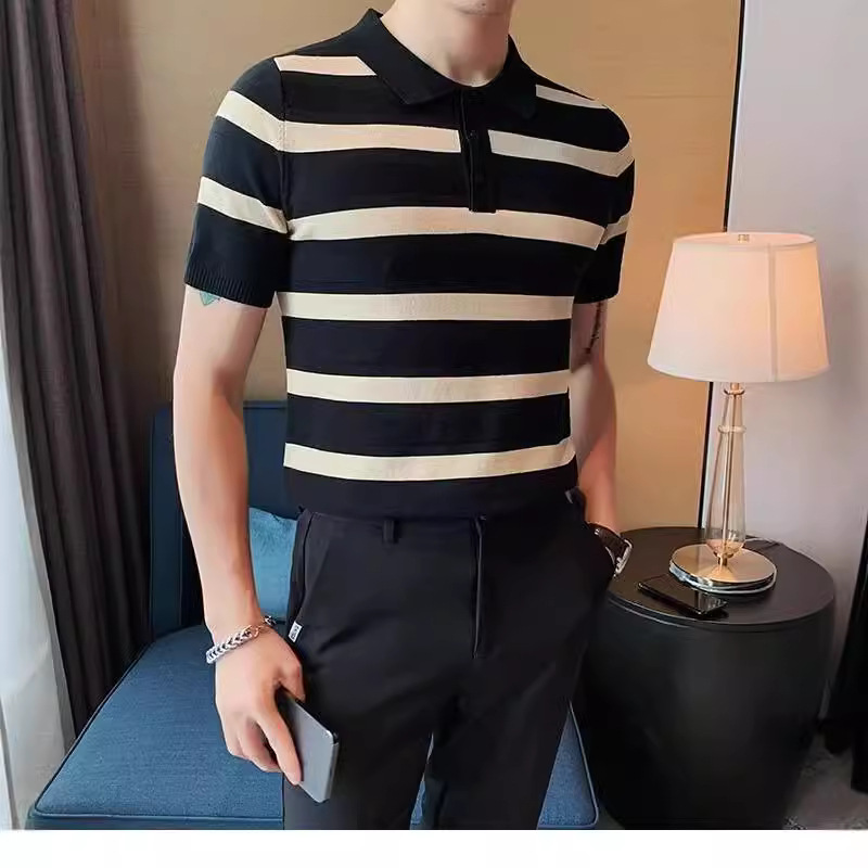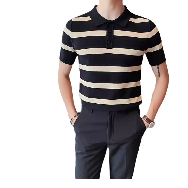 条纹针织冰丝POLO衫男士夏季薄款轻奢英伦修身百搭翻领短袖T恤潮