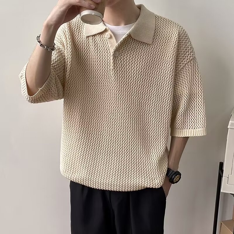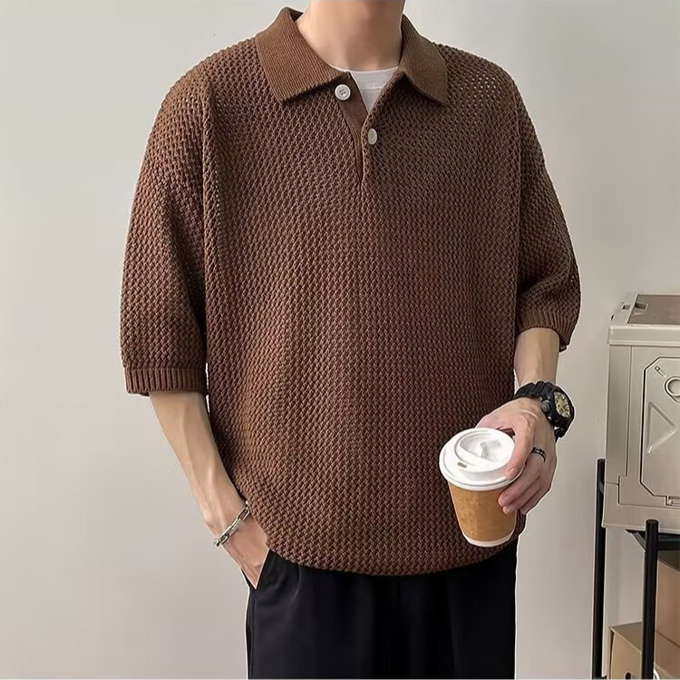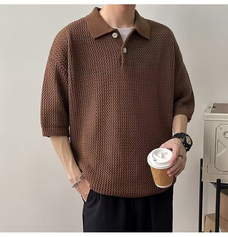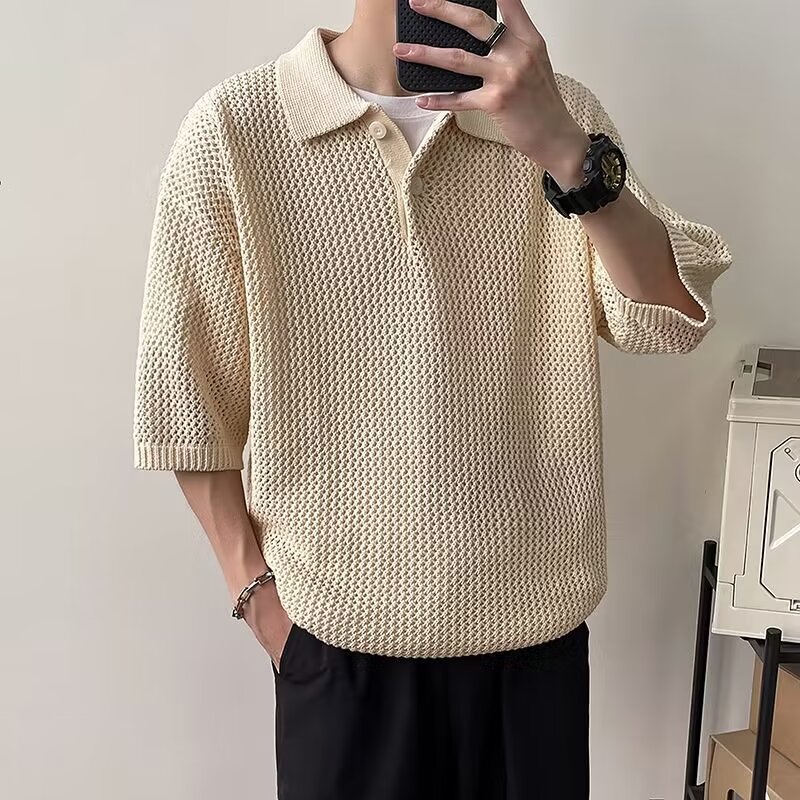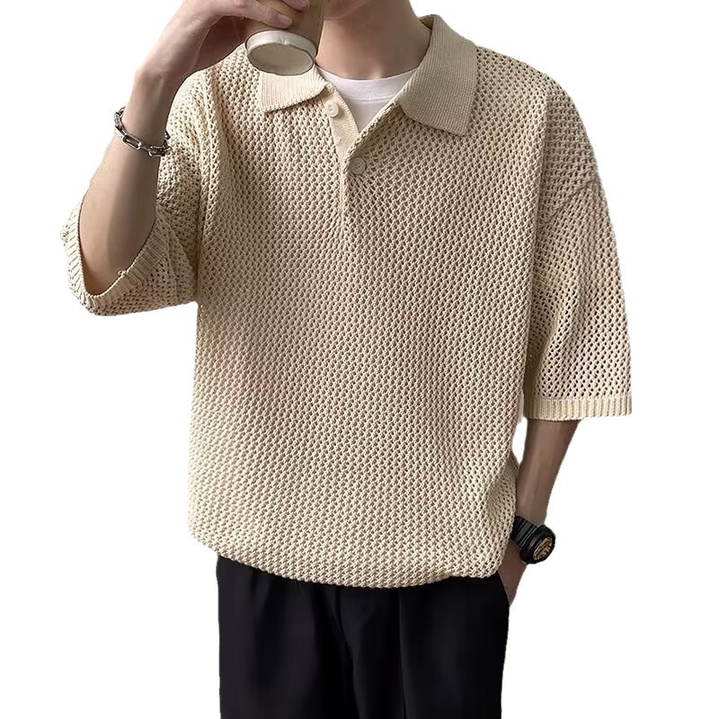 夏季镂空高级感针织polo衫男潮宽松帅气透气翻领半袖t恤