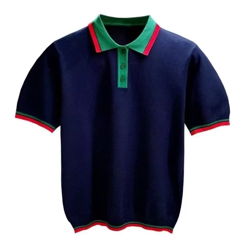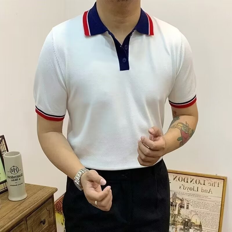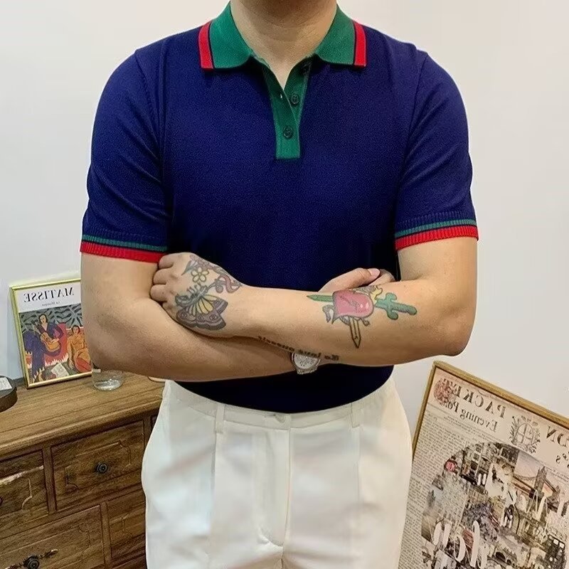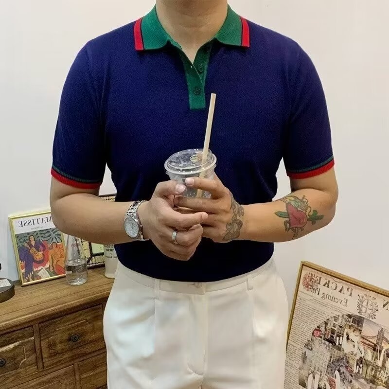 夏季复古拼色翻领修身针织衫上衣时尚奢华男装休闲男士polo衫短袖