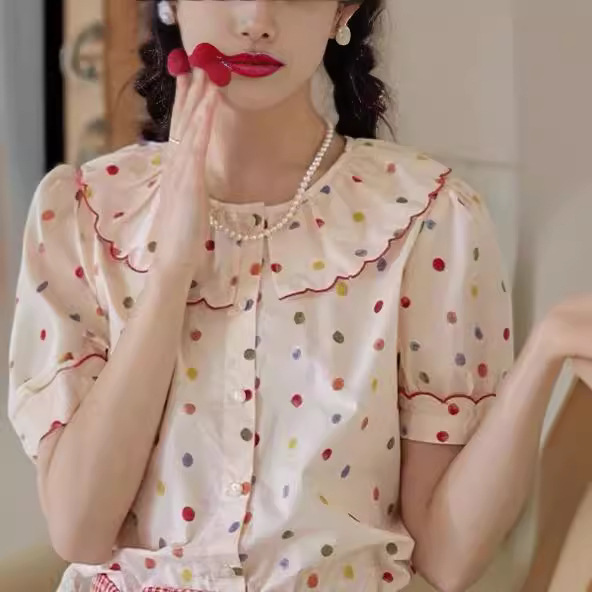 彩色波点花边领短袖衬衫女夏季法式少女感设计小众甜美别致上衣