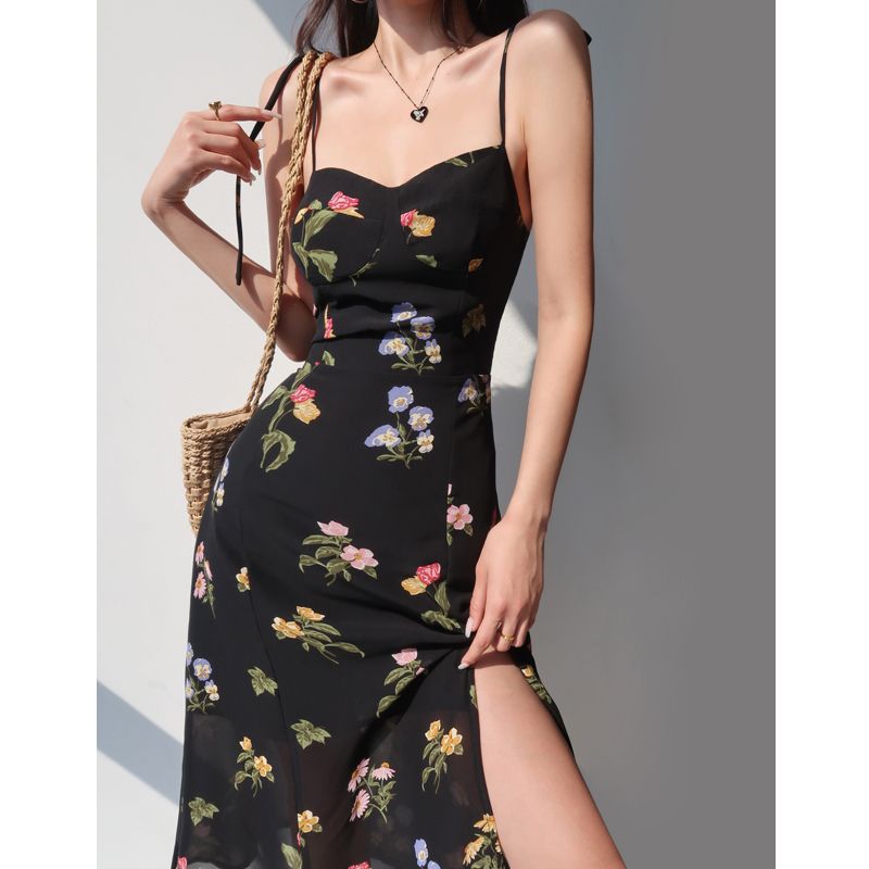 法式黑色印花高腰吊带裙复古性感收腰显瘦侧开叉系带连衣裙长裙女