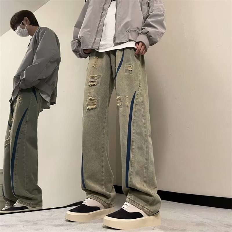 美式高街黄泥抓痕复古直筒裤牛仔裤男宽松水洗显瘦阔腿裤子春夏