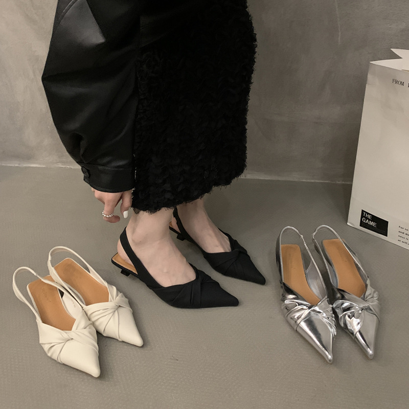 温柔褶皱单鞋扭结设计感小众尖头凉鞋女后空包头细跟浅口矮跟女鞋
