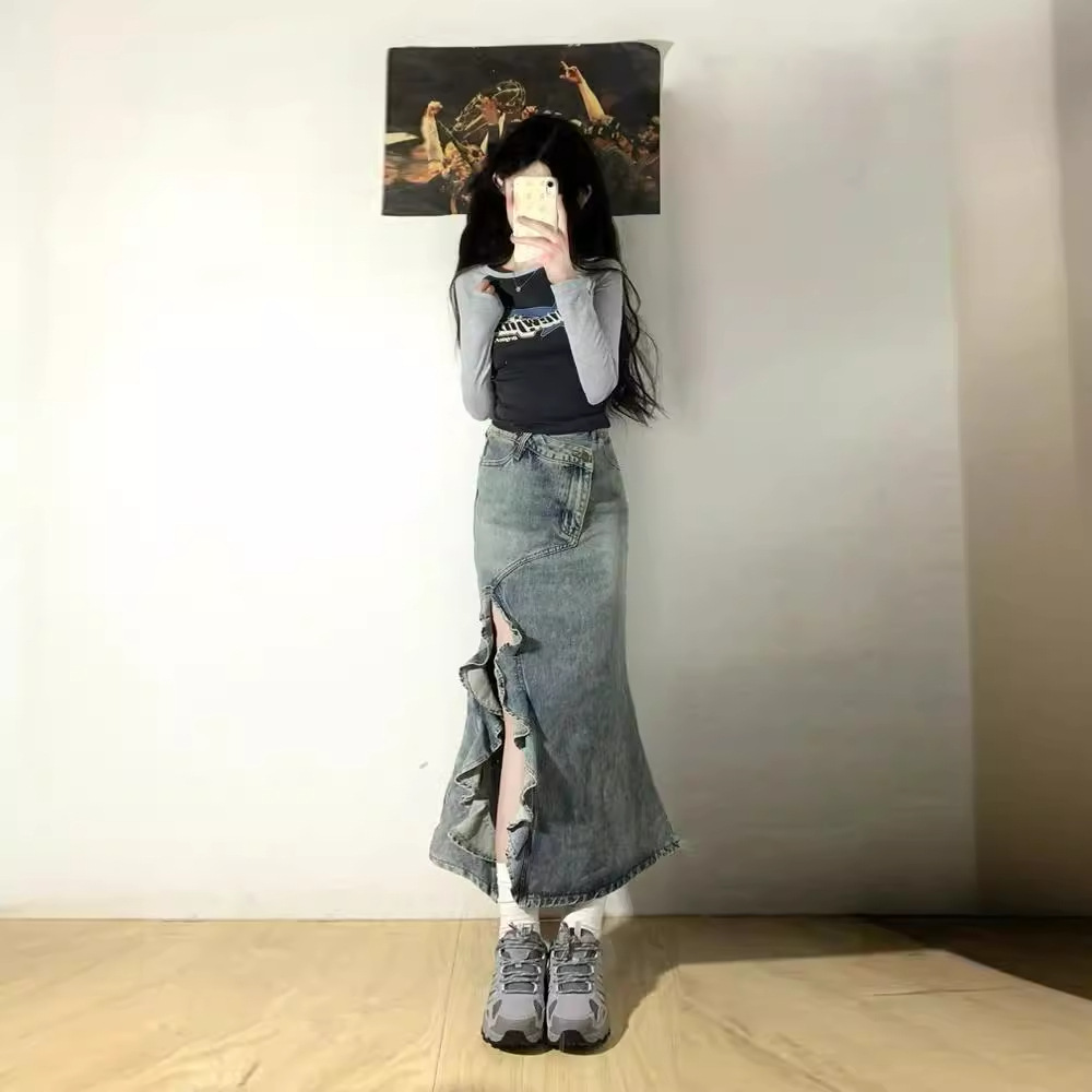 美式复古卜规则中长款牛仔半身裙女夏季新款波浪开叉高腰鱼尾裙子