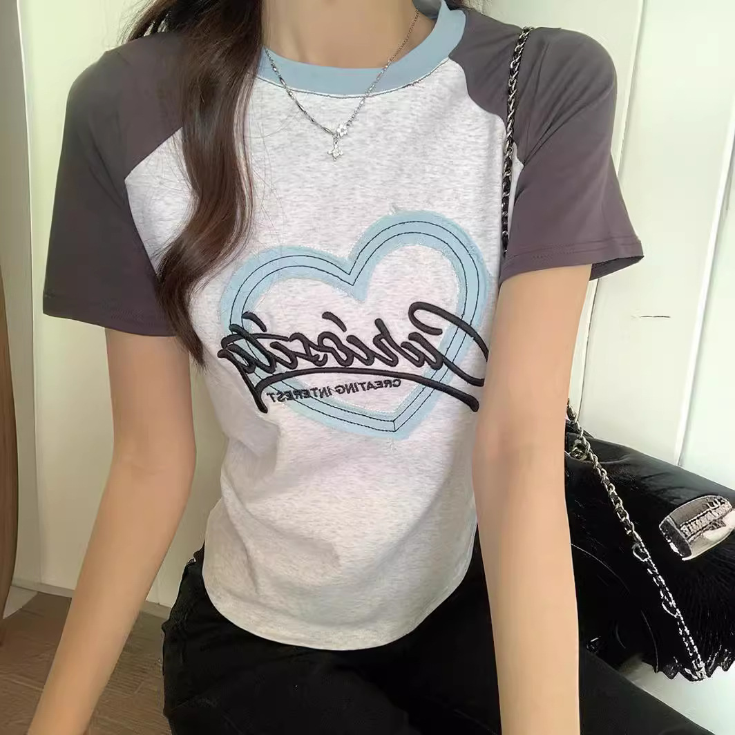 夏季新款撞色短袖t恤女美式设计感插肩袖修身正肩短款上衣ins甜美