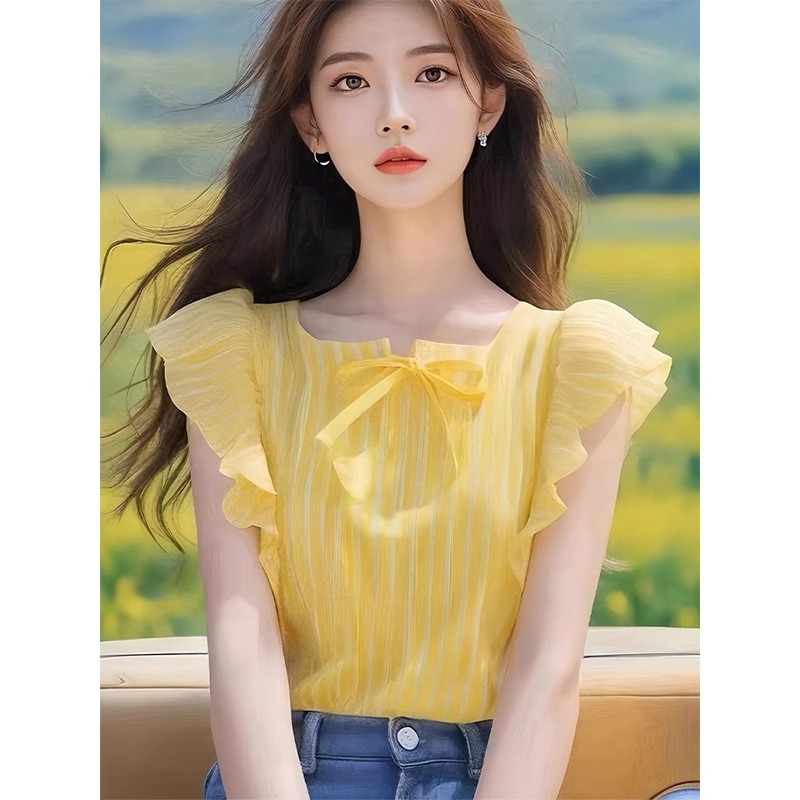 黄色条纹短袖衬衫女2025新款夏季气质小衫法式独特别致小飞袖上衣