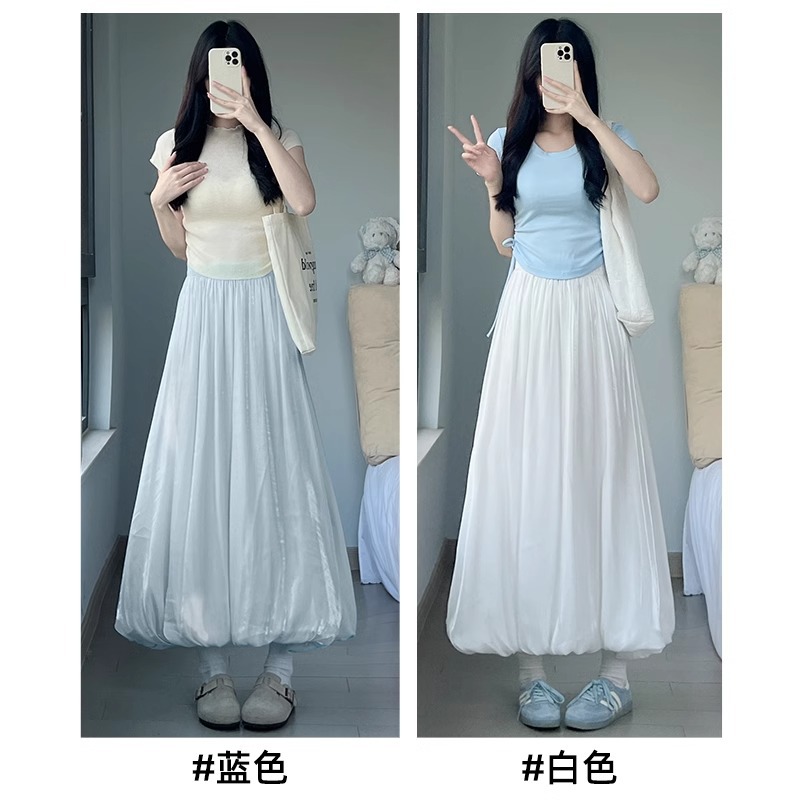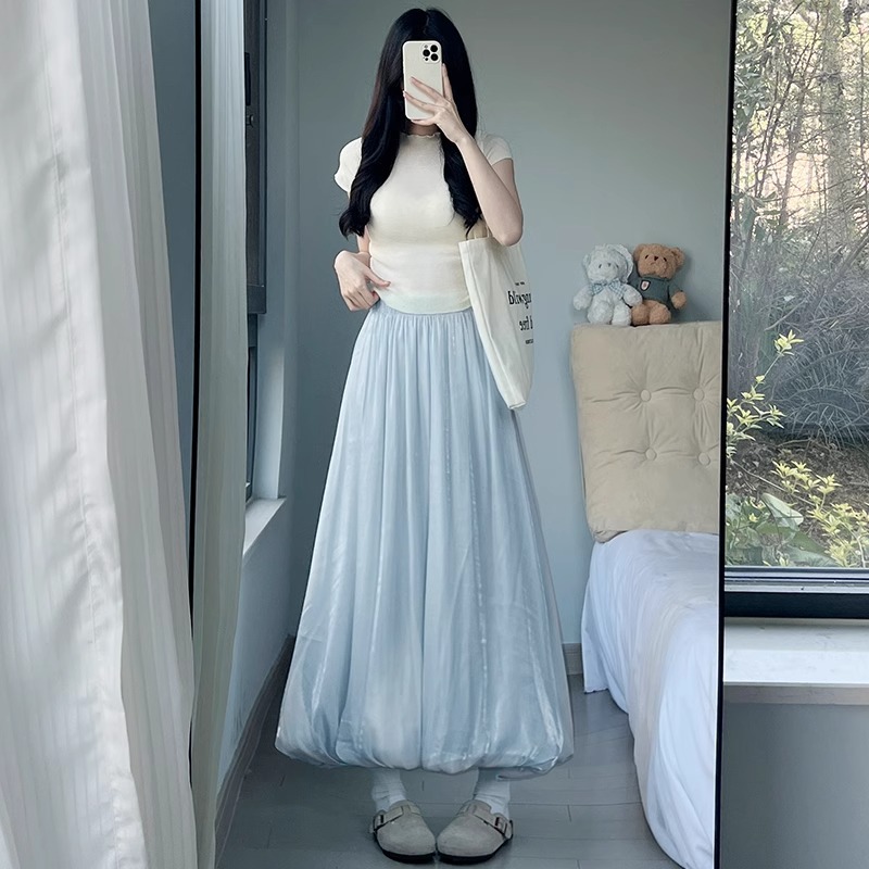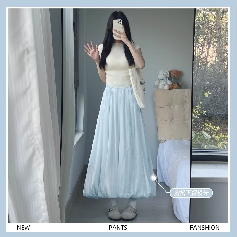 蓝色蓬蓬花苞裙女2025夏季新款高腰a字显瘦流光纱裙赫本风半身裙