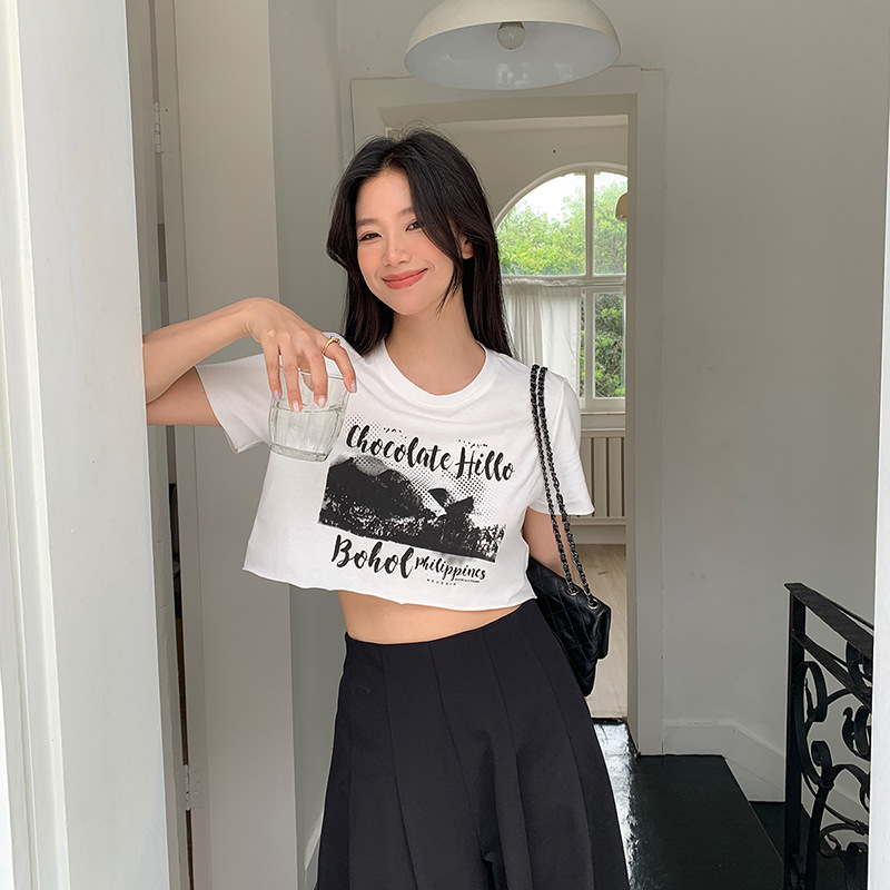 诠释美 NEW OPEN夏短袖t恤女辣妹正肩短款印花白色上衣82526