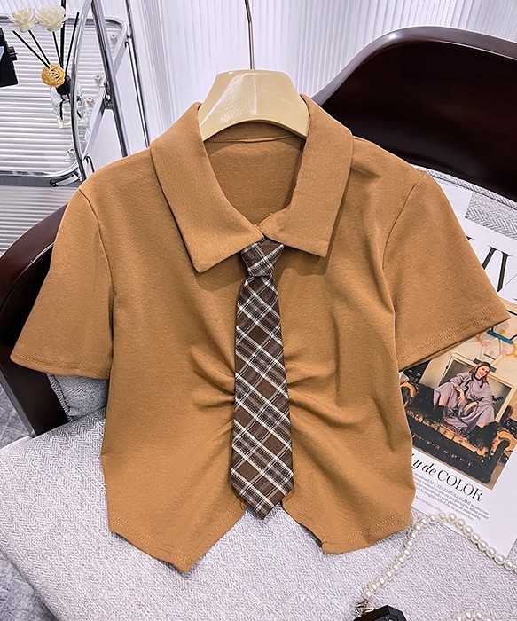 夏季新款复古polo领正肩衬衫女学生韩版修身ins短袖衬衣t恤