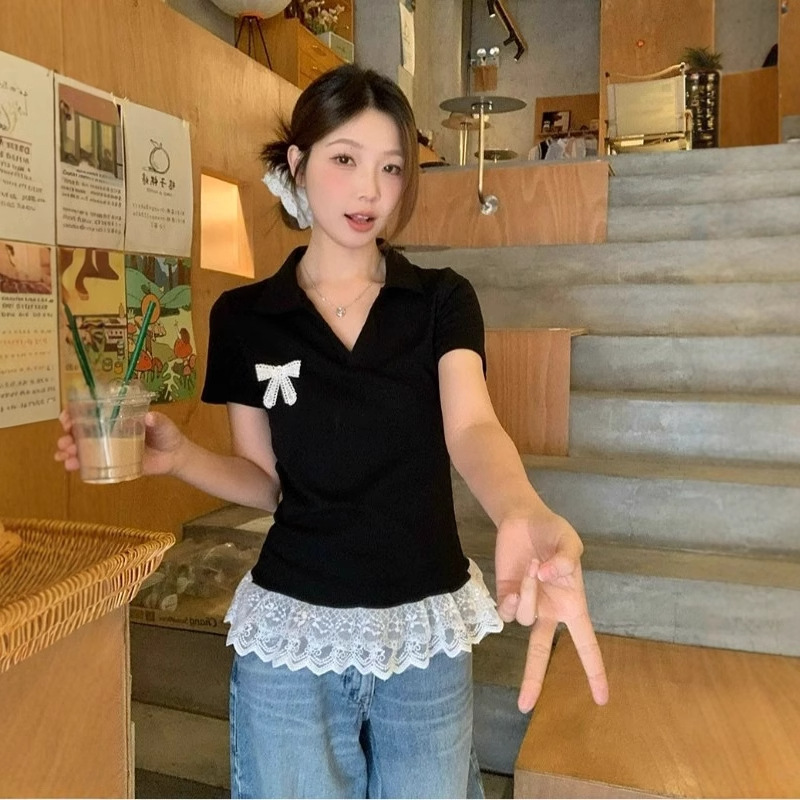 时尚大码2025夏装新款胖mm韩版polo领百搭潮流蕾丝蝴蝶结短袖T恤