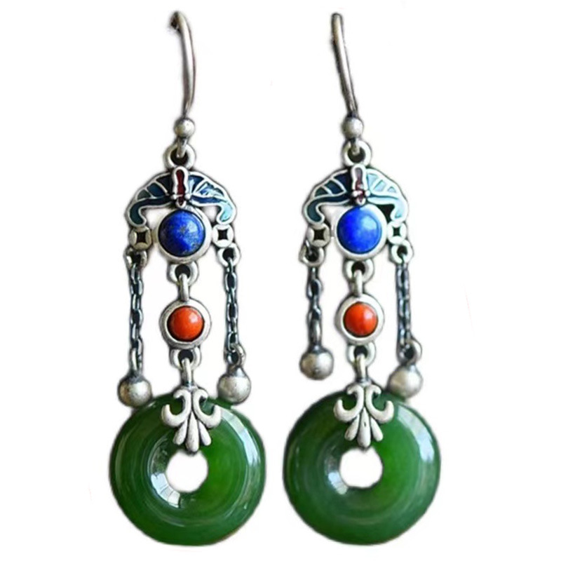 民族风耳饰s925银饰品女式烧蓝流苏 和田碧玉耳坠 新品