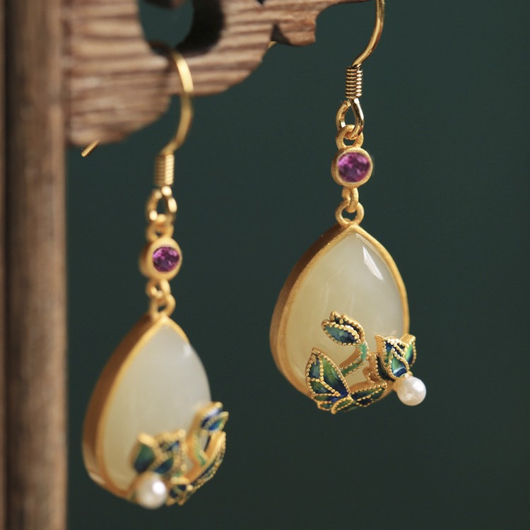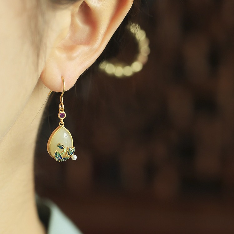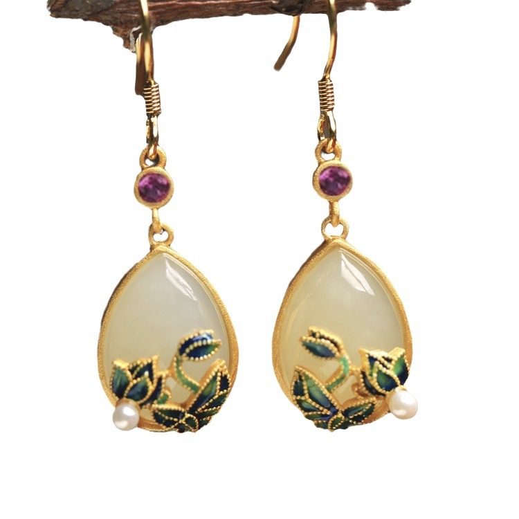 宫延风铜镀金滴胶荷花耳饰珐琅彩绘镶和田复古耳环