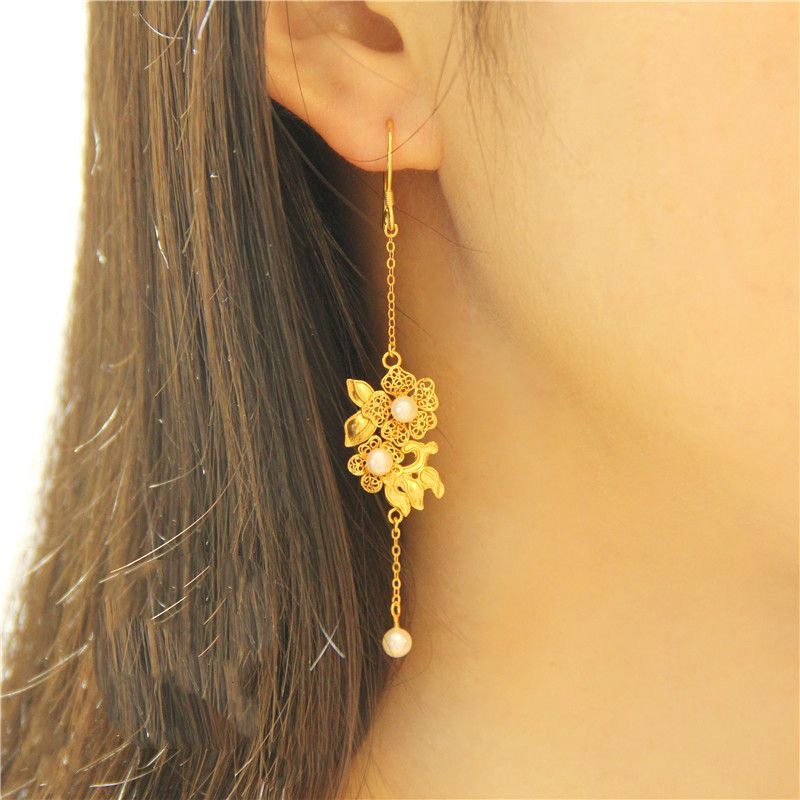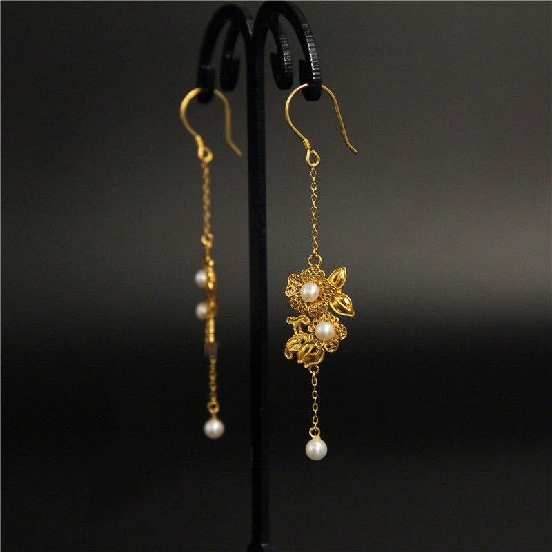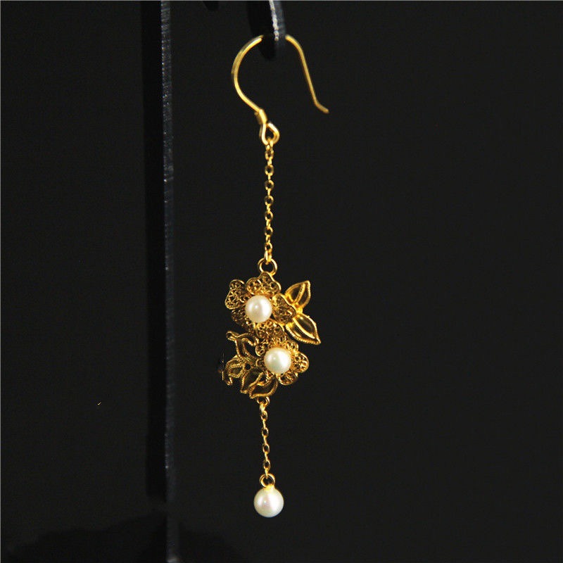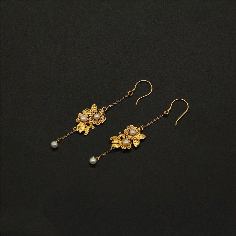 国风镀金搭配汉服旗袍复古贝珠并蒂花开耳钉小众高级饰品配饰耳坠