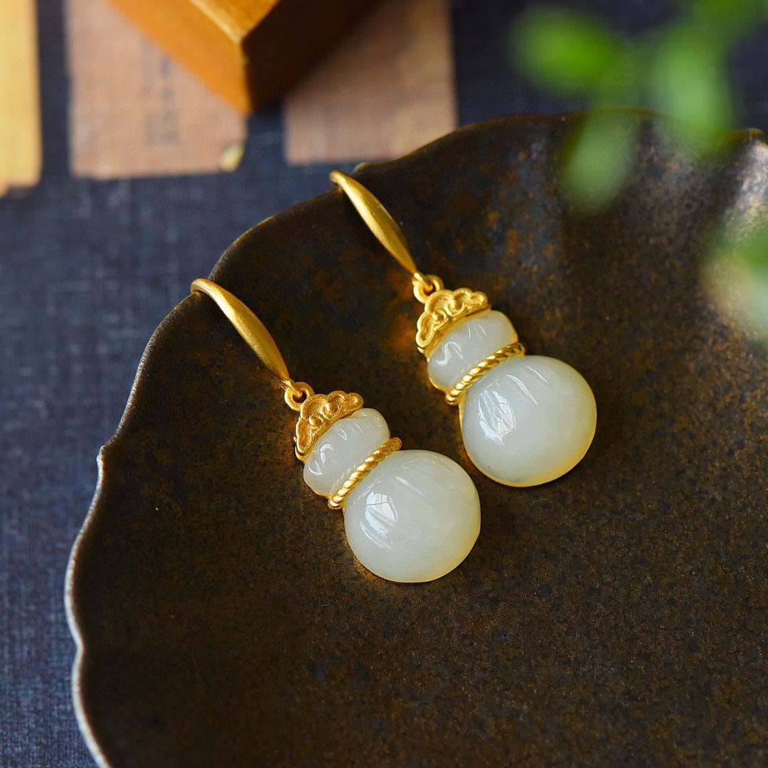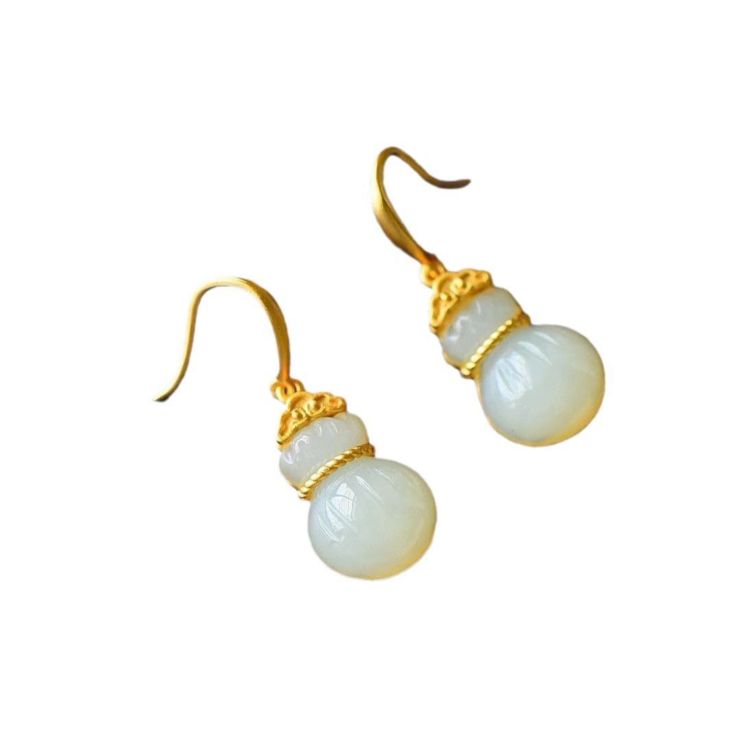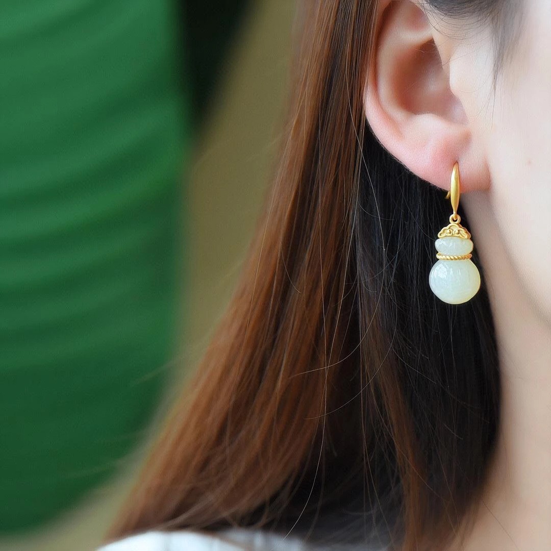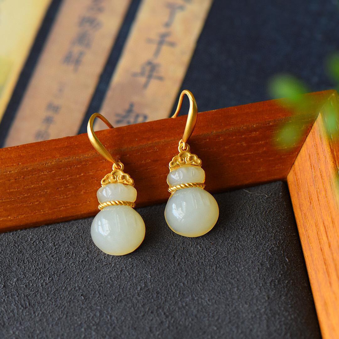 小钱袋耳环女复古国风耳坠中国风纯银鎏金如意耳钩女款白玉耳饰