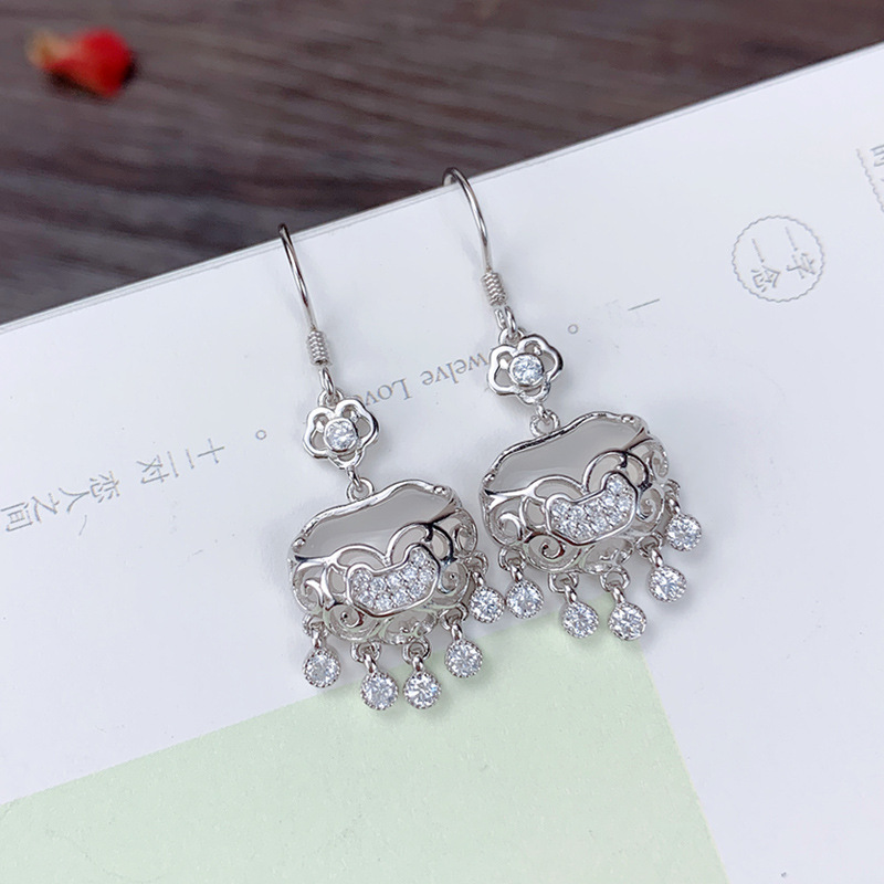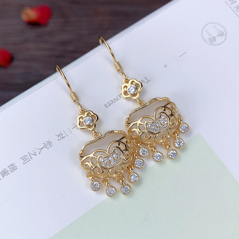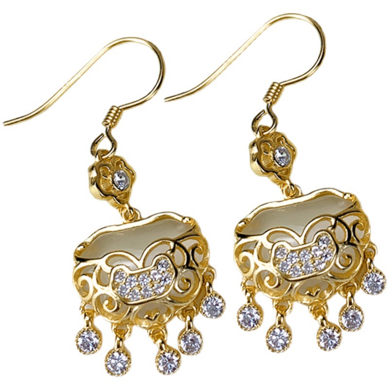 925纯银玫瑰金如意平安锁流苏耳环玉髓耳钩古典气质国风耳坠饰品