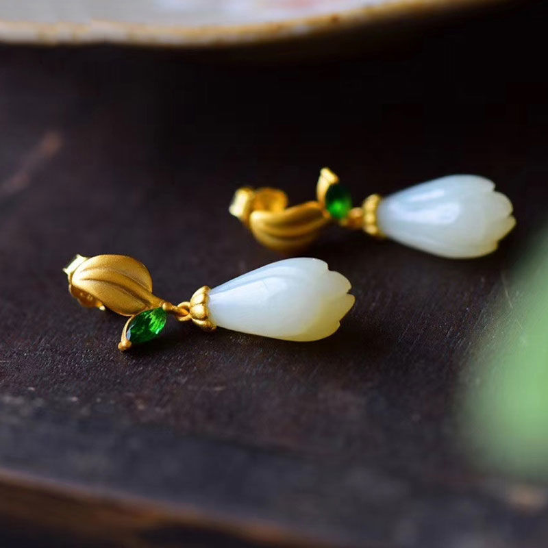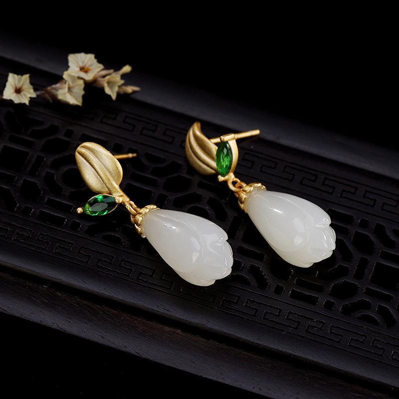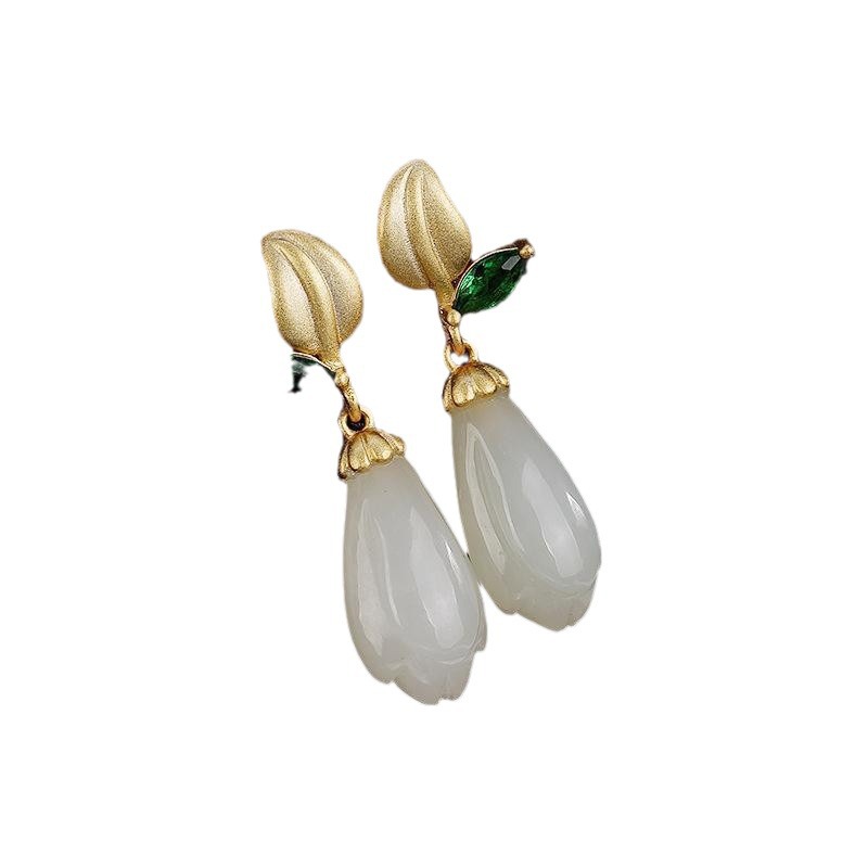 s925银镀金镶嵌天然和田玉白玉配碧玉玉兰花耳坠女款自然简约耳饰