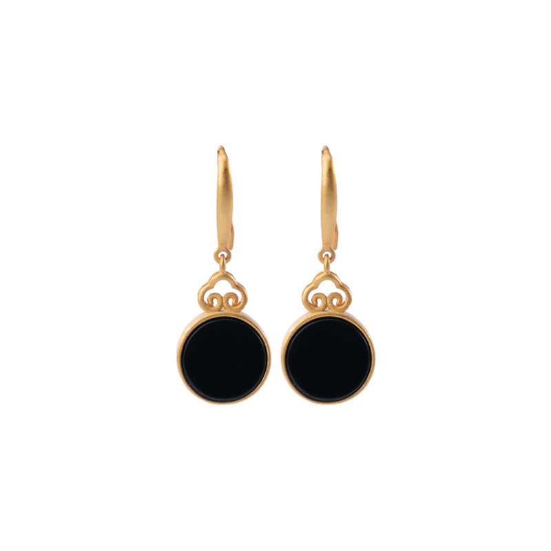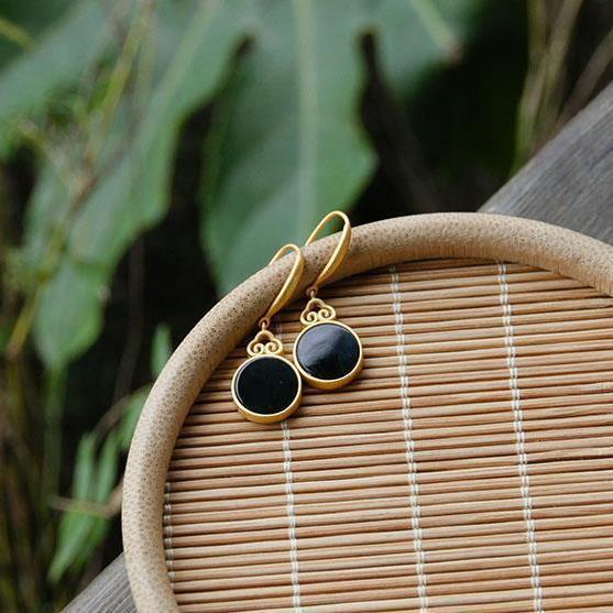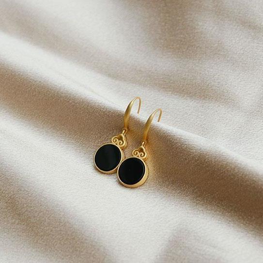 天然和田玉墨玉镜面圆形耳坠S925纯银玉石耳环大牌古风耳饰防过敏