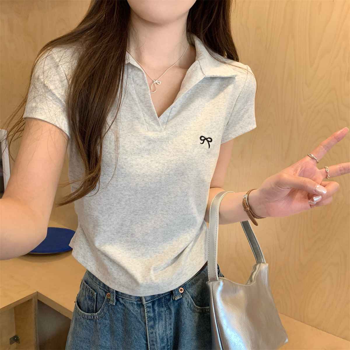 设计感翻领蝴蝶结刺绣T恤女夏小个子褶皱正肩学院风短款别致上衣
