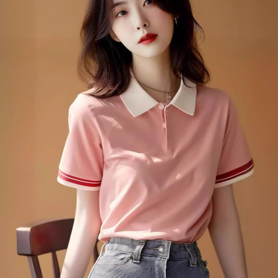 粉色POLO领t恤女新款夏季甜美上衣洋气减龄撞色翻领短袖体恤
