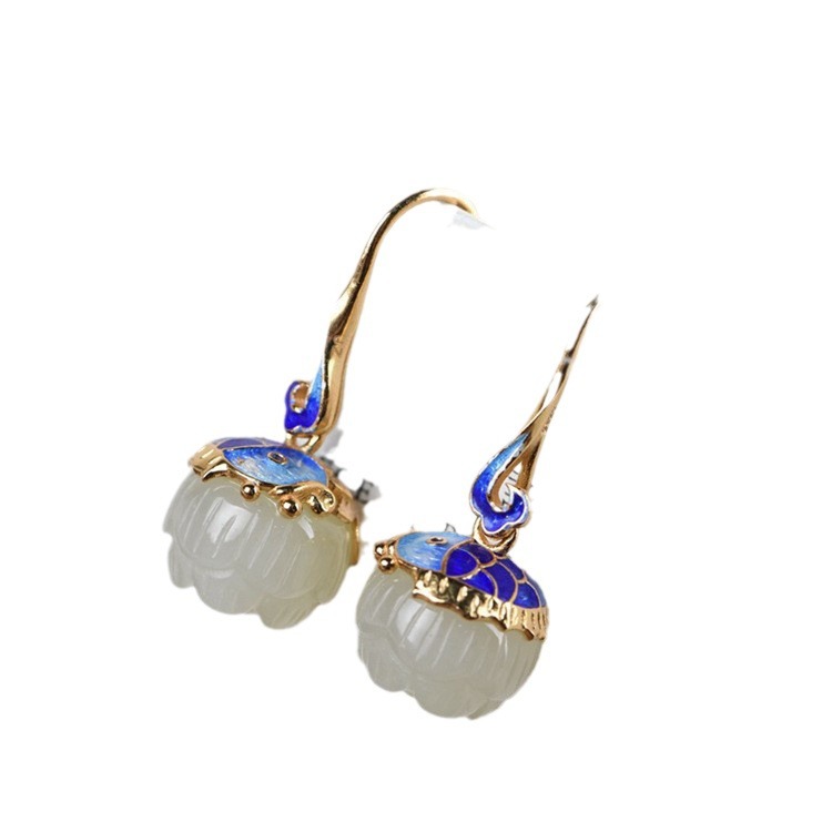 S925银镀金镶嵌天然和田女款时尚烧蓝鲤鱼富贵有余耳坠