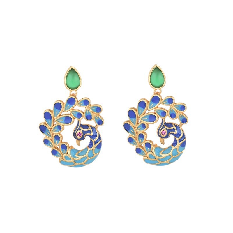 中国复古汉服旗袍饰品彩绘珐琅孔雀天然玉髓玛瑙复古耳环耳钉女
