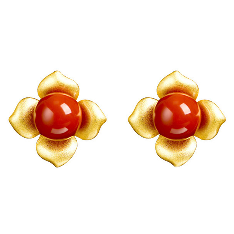 小清新镶嵌南红玛瑙耳钉百搭个性气质不规则花朵镀金女士简约饰品