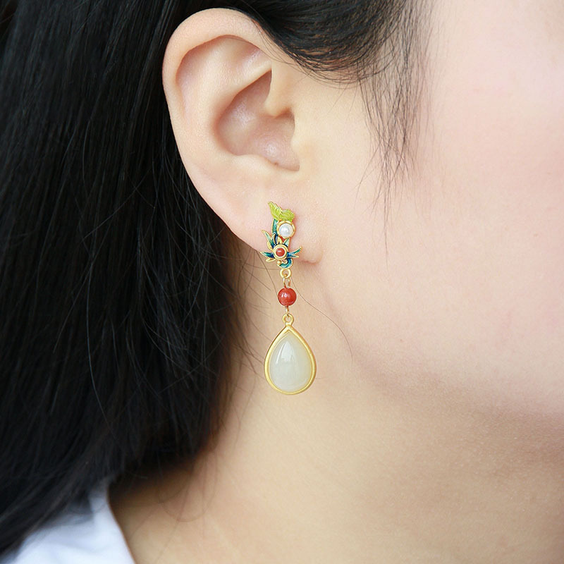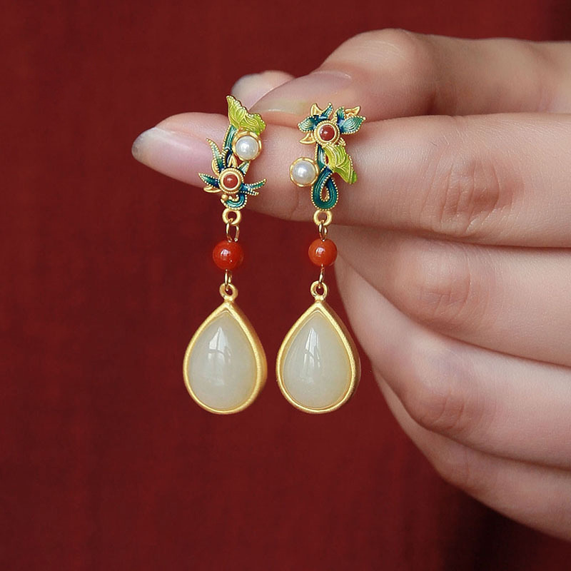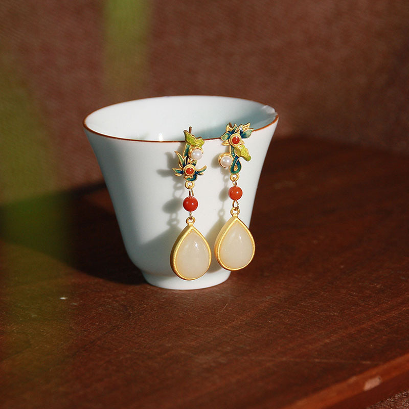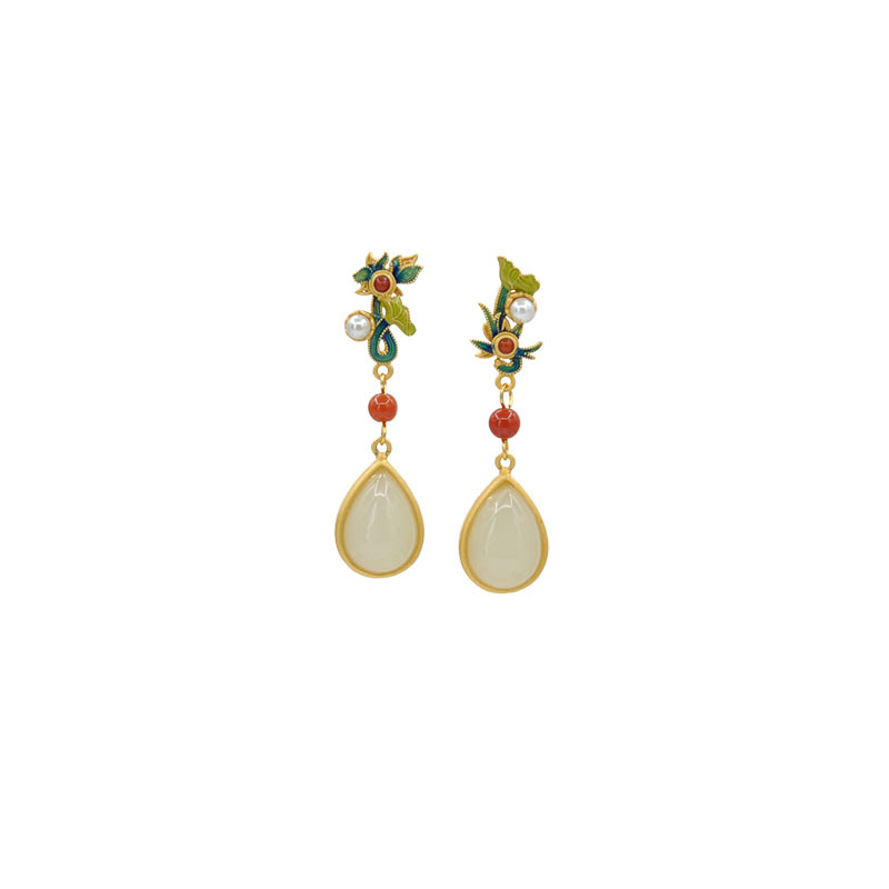|初荷天然和田玉耳环女玉石耳坠纯银镀金复古长款耳饰设计感