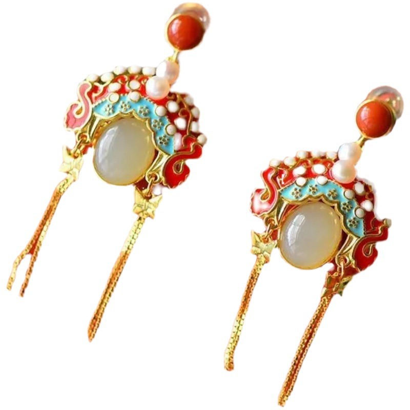 花开童年和田玉官娘子S925银耳钉鎏金珐琅彩耳环京剧脸谱耳饰