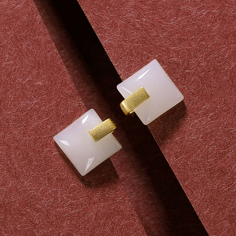 和田玉正方形耳钉S925纯银白玉石几何耳坠时尚宫廷风配饰精美耳饰