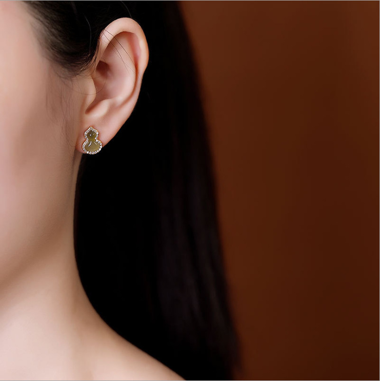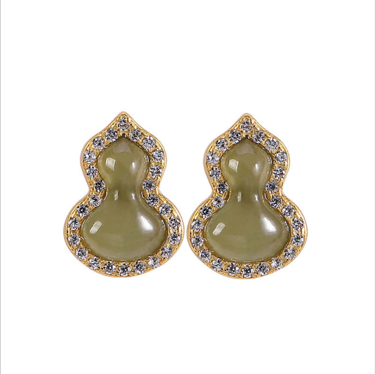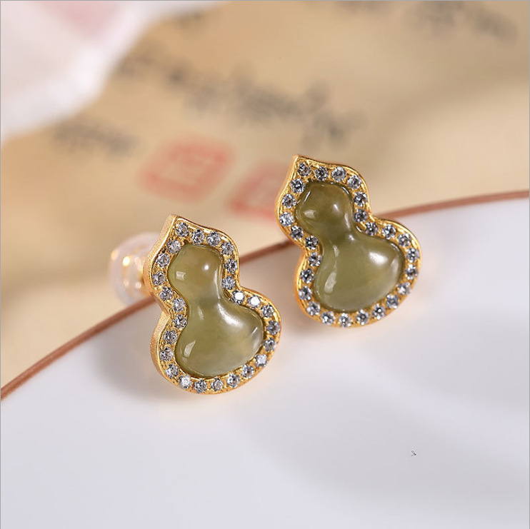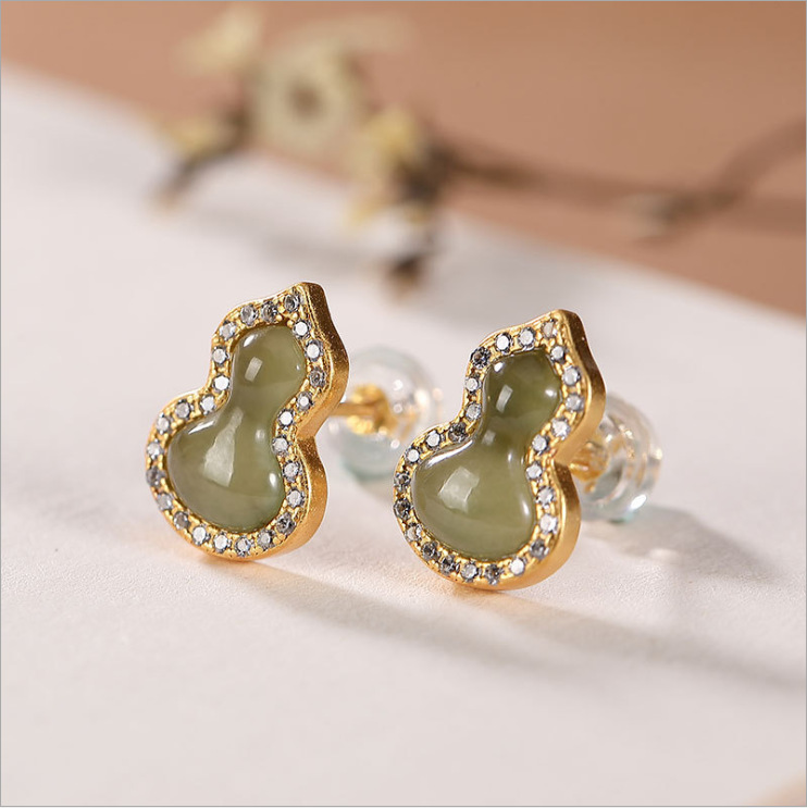 天然青玉葫芦耳钉925纯银镀金镶钻和田玉石耳饰宫廷风精美配饰
