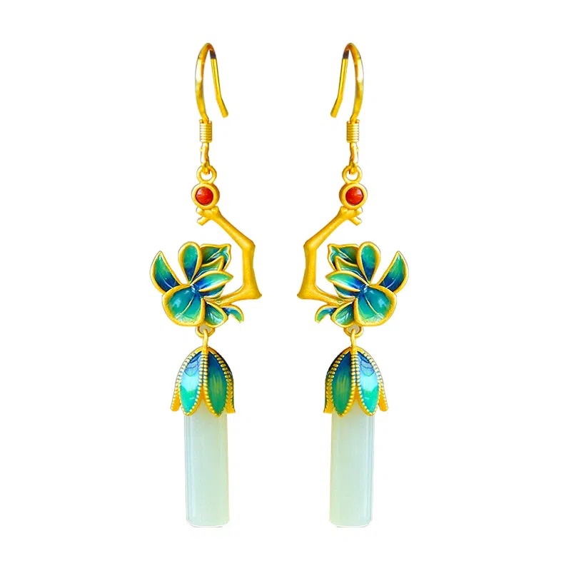 S925纯银针古风珐琅玉兰花耳环女复古仿玉流苏古典彩绘耳饰品