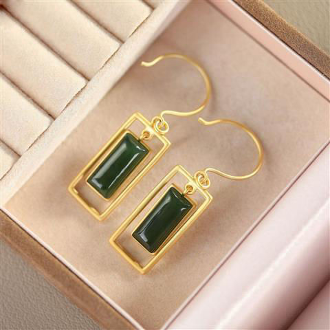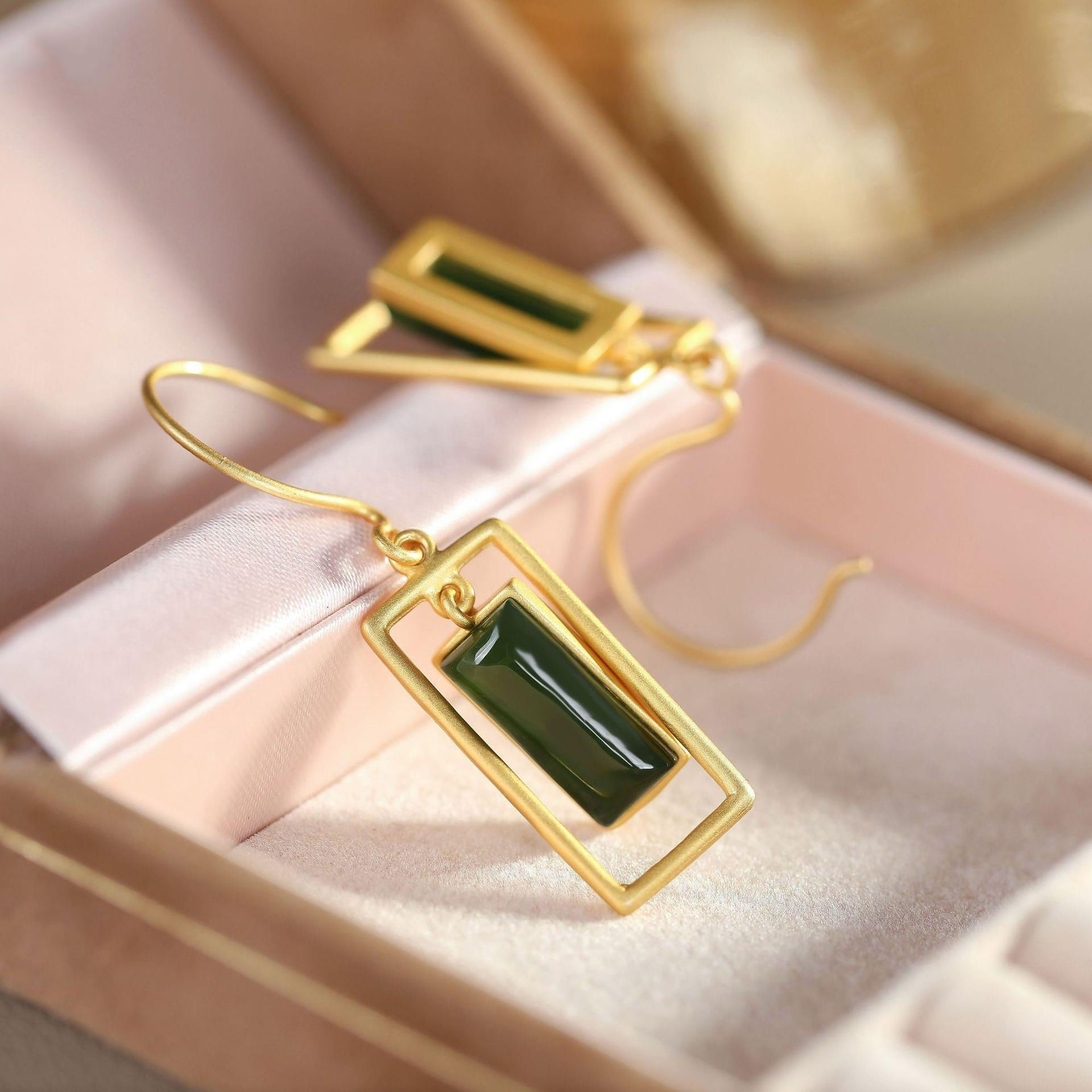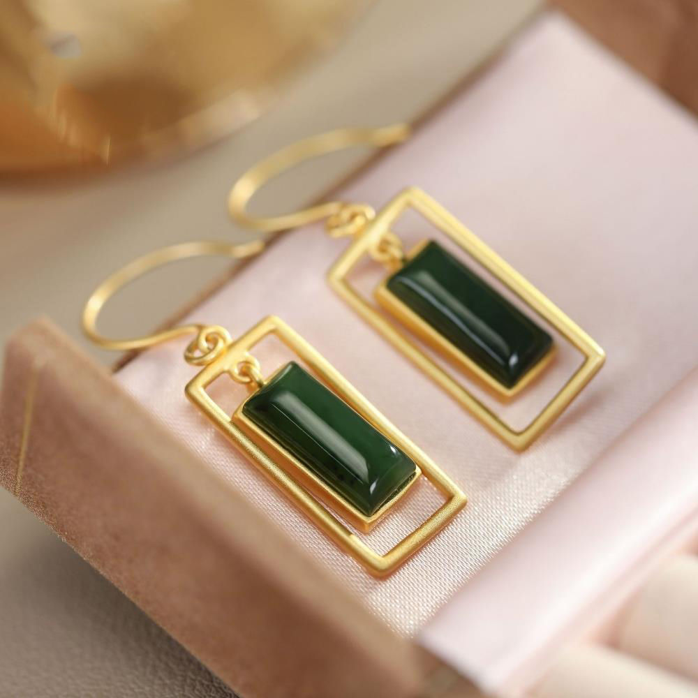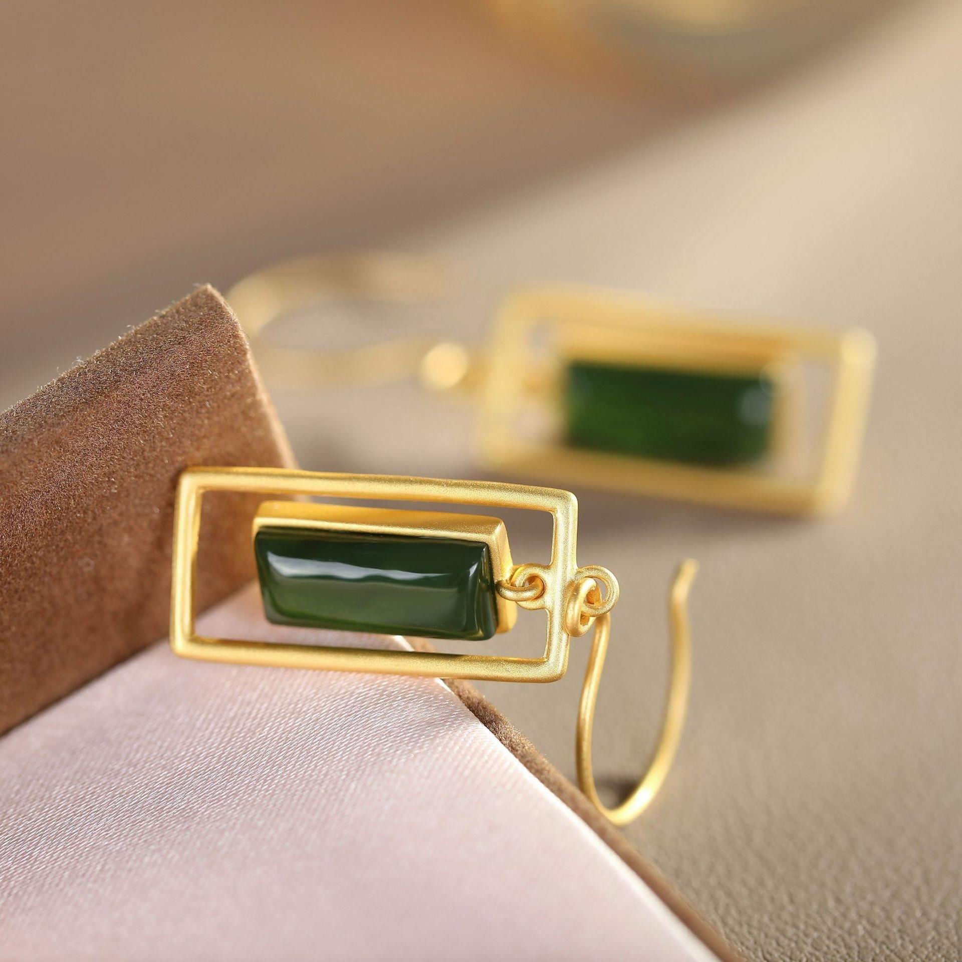 镶嵌碧玉几何形巴洛克首饰女S925纯银简约鎏金工艺轻奢耳饰品耳环