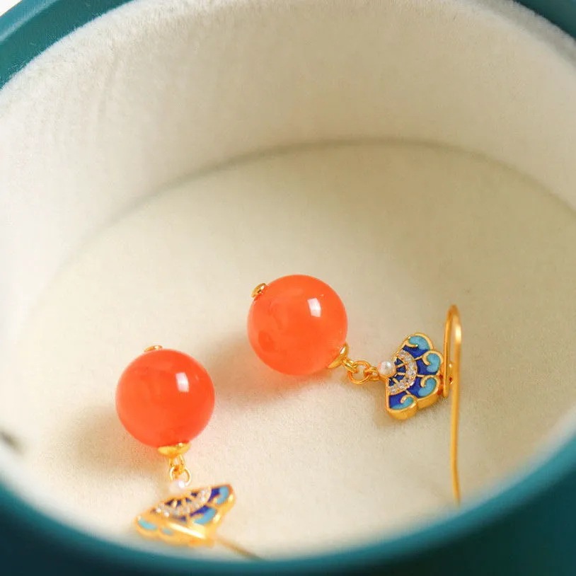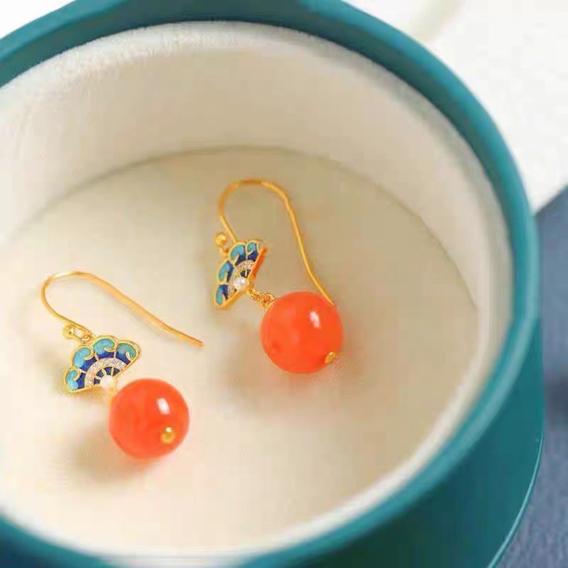 南红民族风如意耳饰耳坠古风古典圆珠纯银s925银气质防过敏耳环