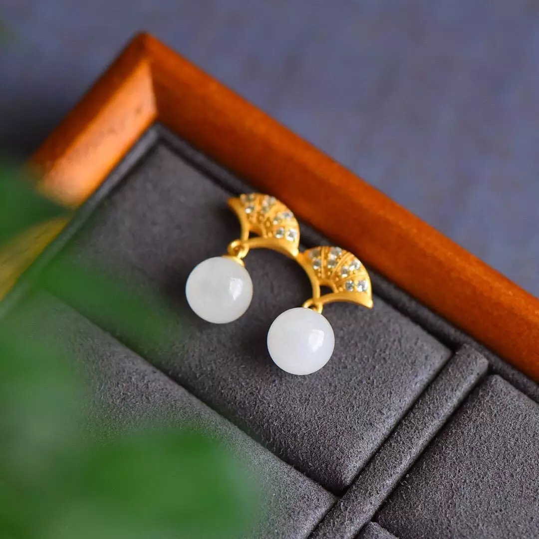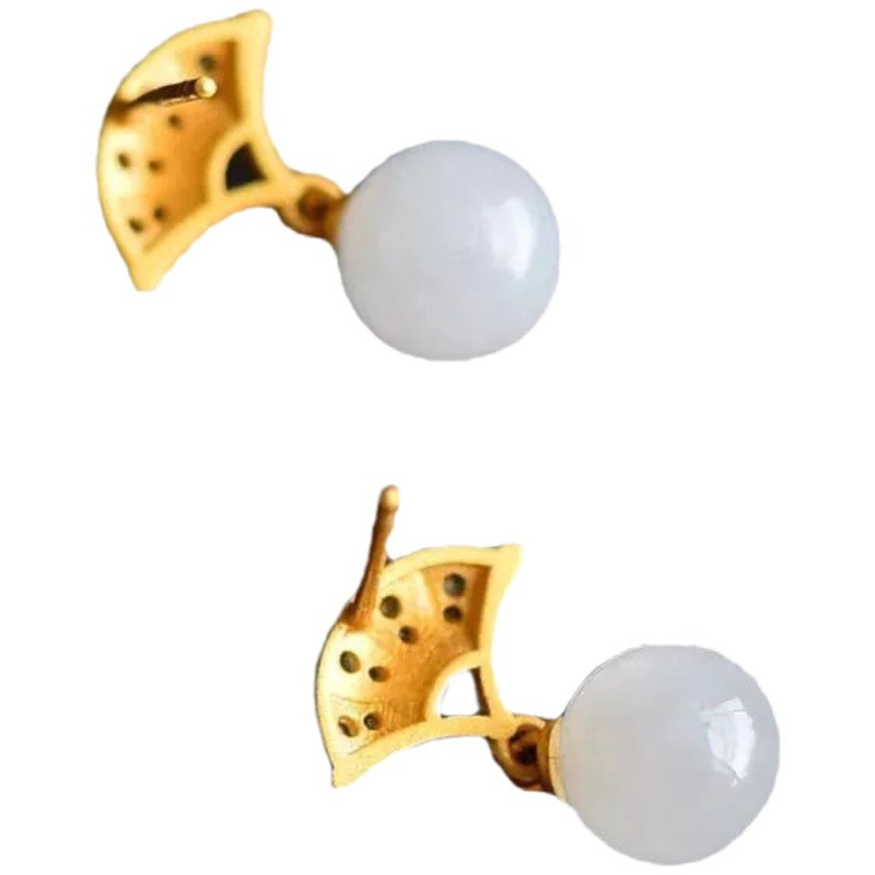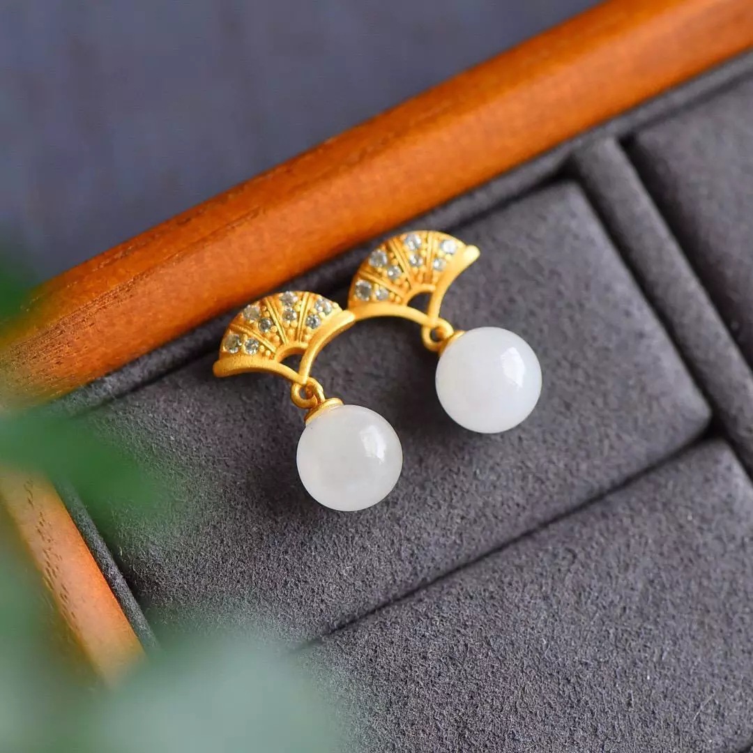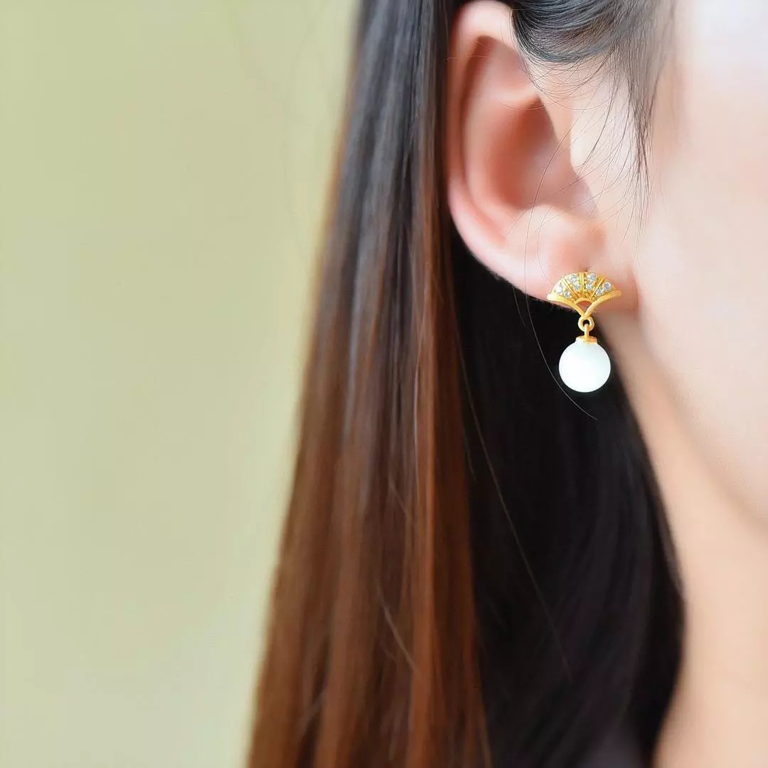 天然白玉耳钉女古典小扇子潮流小巧精致百搭耳环纯银防过敏耳饰