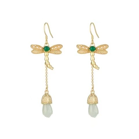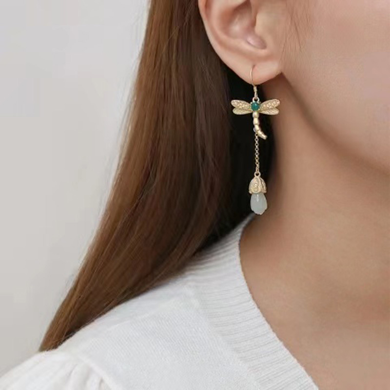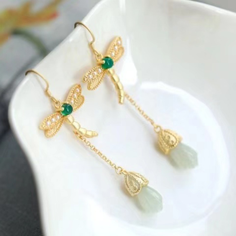 流苏蜻蜓耳坠时尚设计镶嵌天然和田青玉耳坠气质小众轻奢百搭镀金