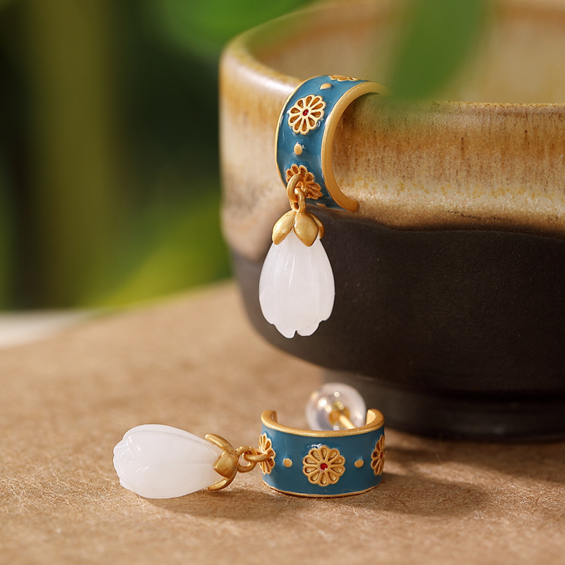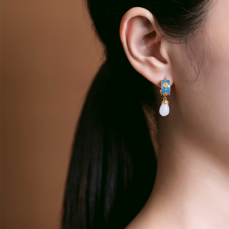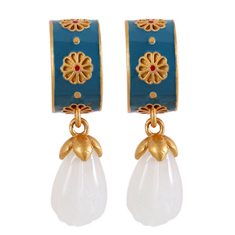 蓝田生玉耳钉小清新复古时尚气质镶嵌天然和田白玉耳钉饰品
