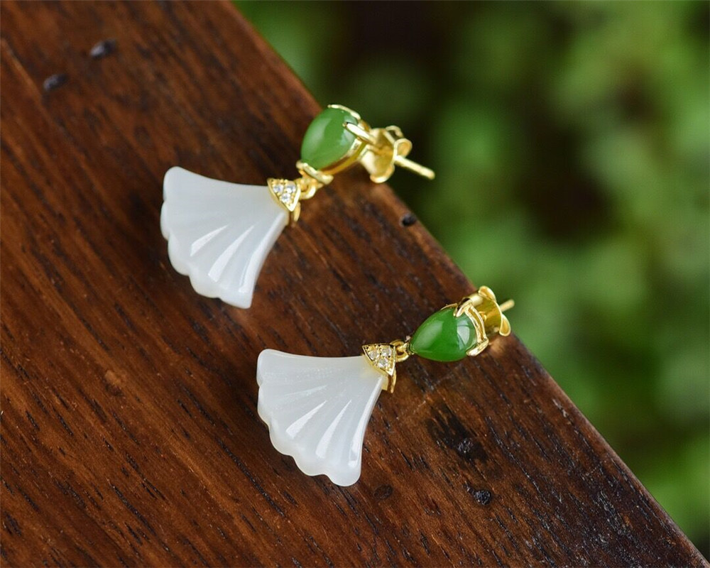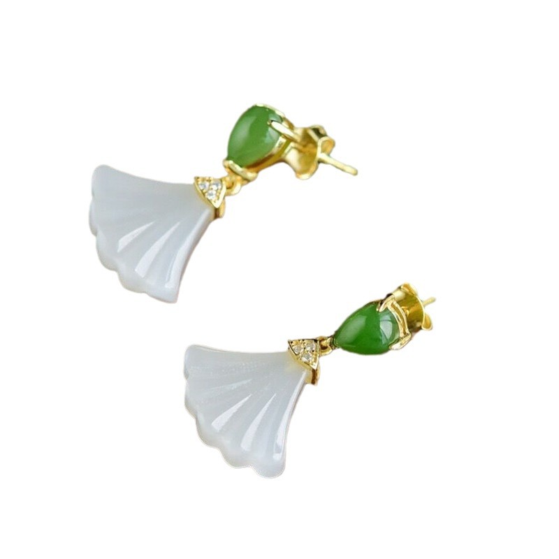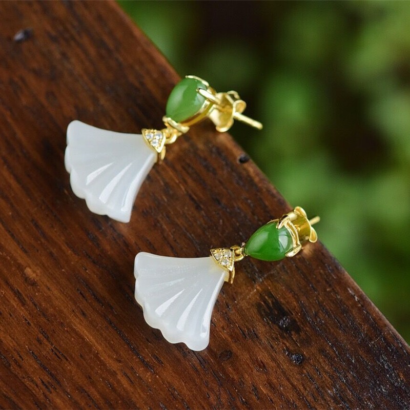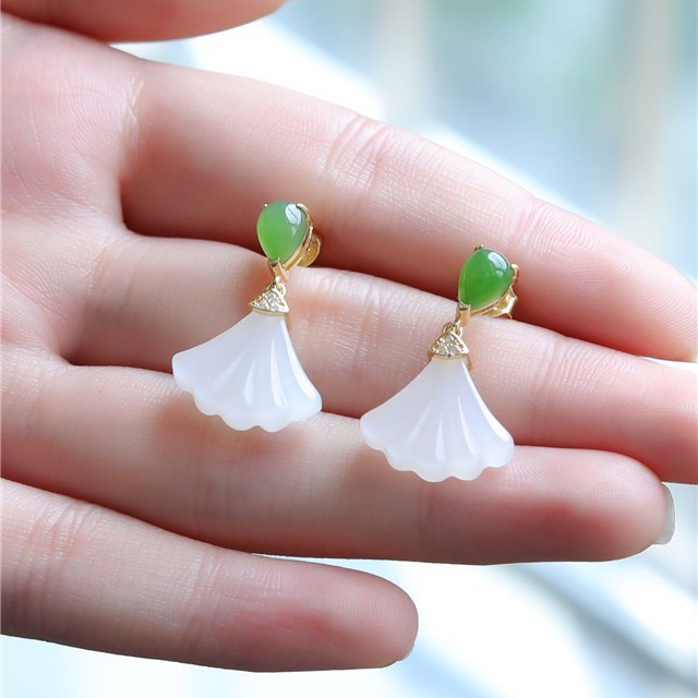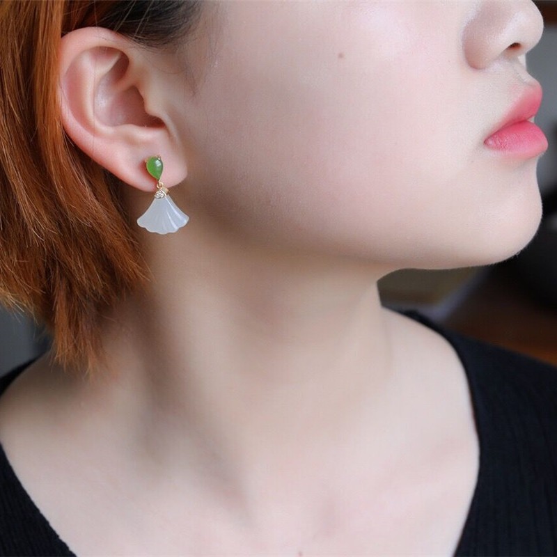 s925银镶和田玉耳钉天然白玉银杏叶搭配碧玉点缀感耳钉
