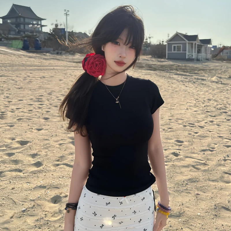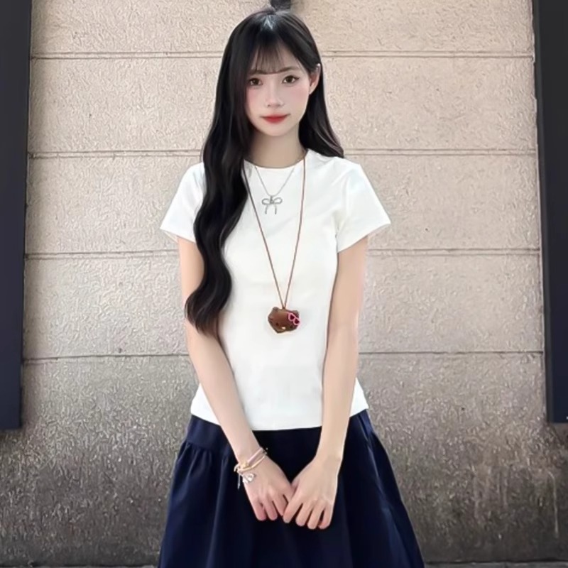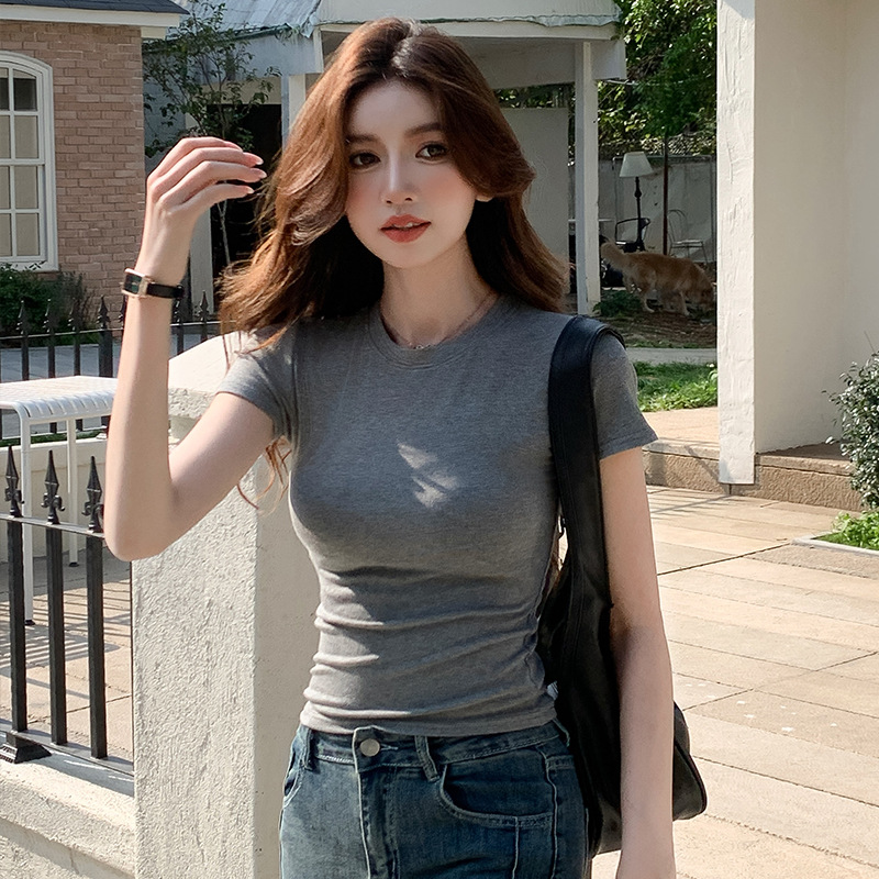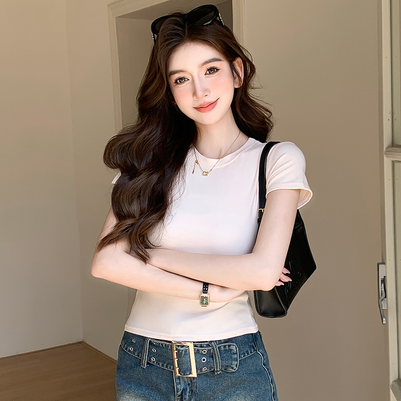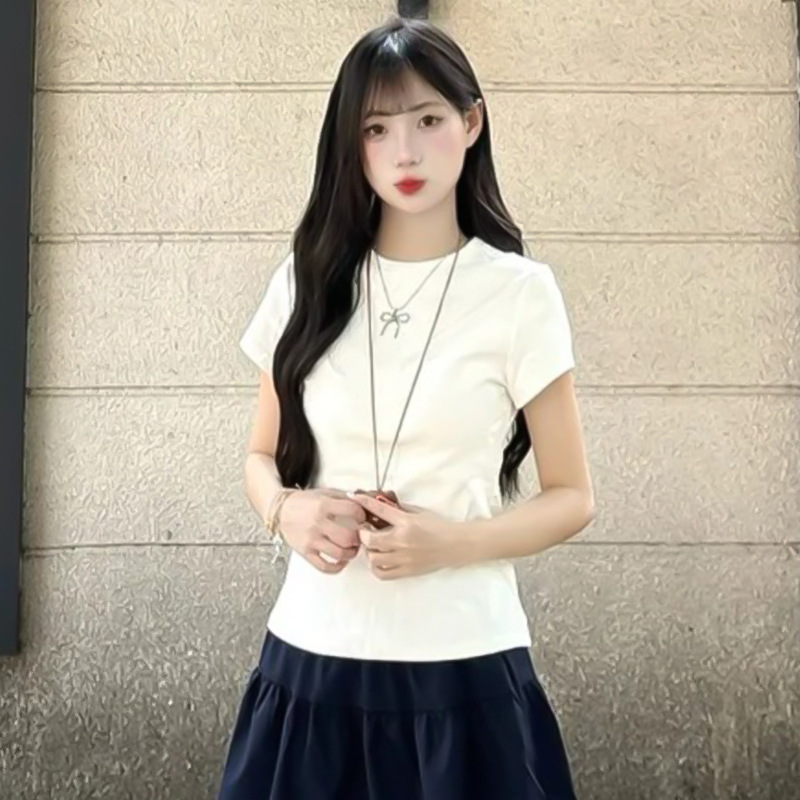 韩系白色正肩圆领短袖t恤女夏季外穿修身显瘦休闲紧身打底上衣薄