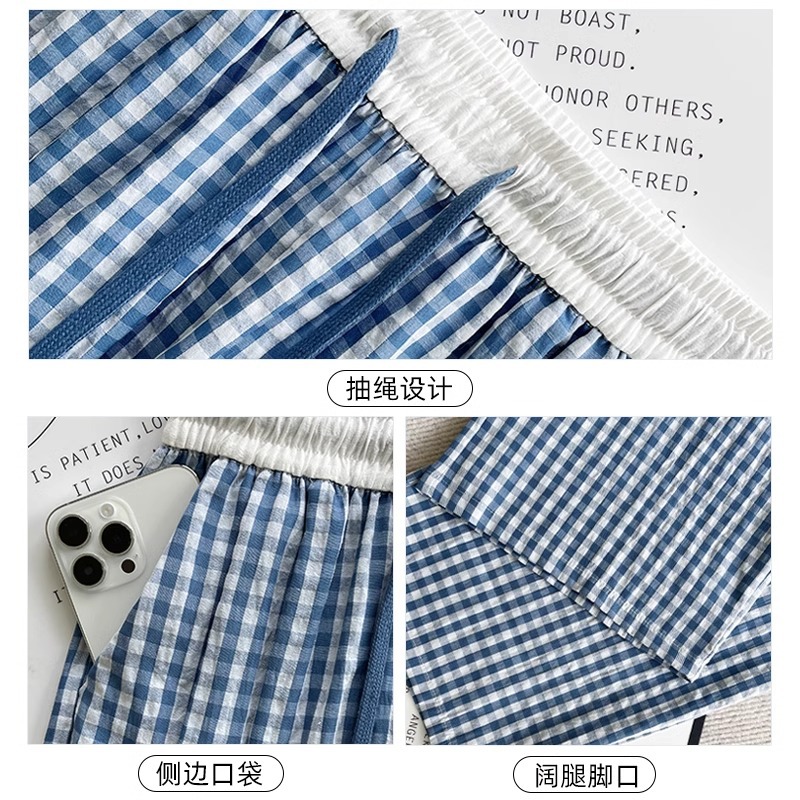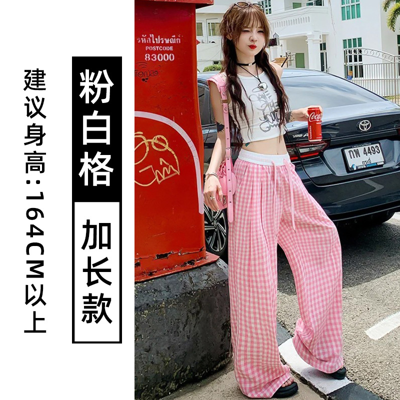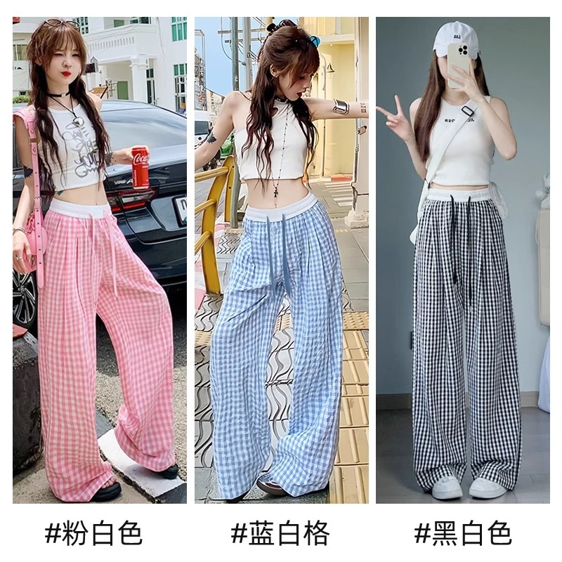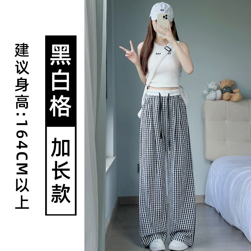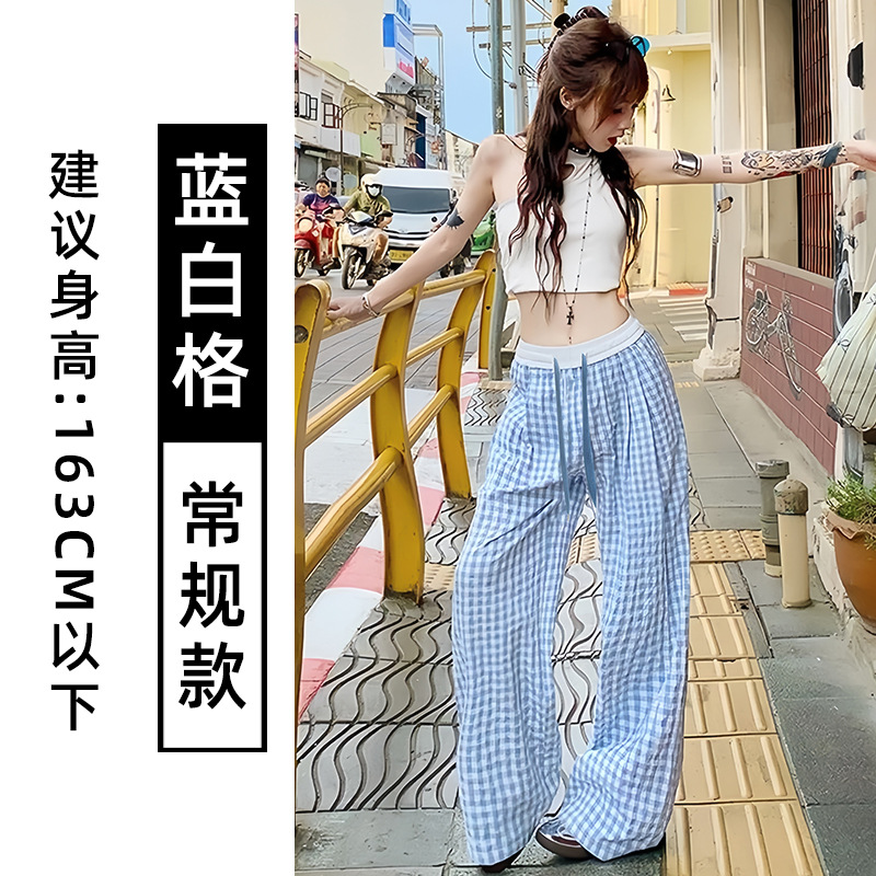 蓝白格子裤子女夏季薄2025新款小个子高腰垂感休闲遛弯拖地阔腿裤